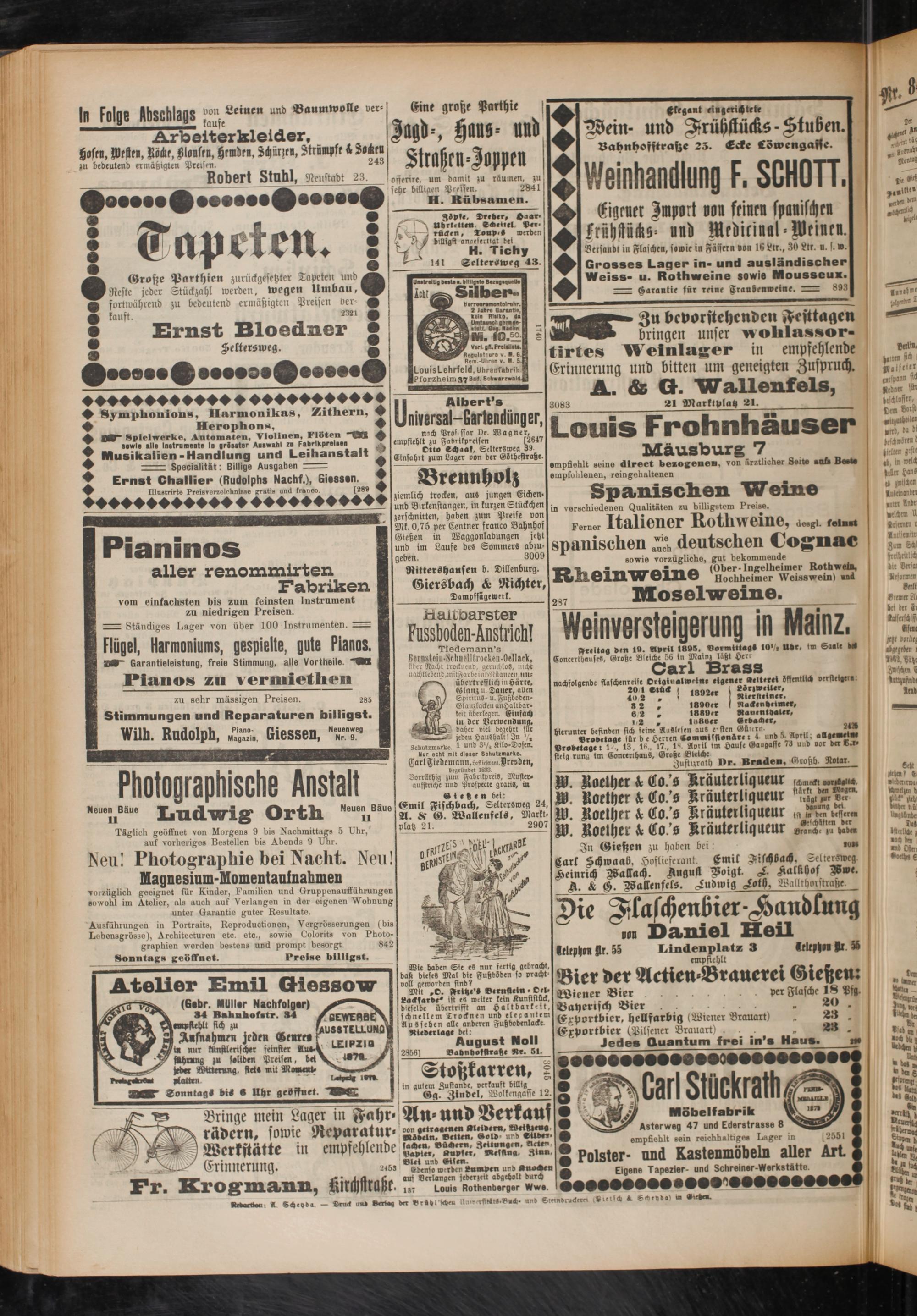 Ausführungen in Portraits, Reproductionen, Vergrösserungen (bis Lebensgrösse), Architecturen etc. etc., sowie Colorits von Photographien werden bestens und prompt besorgt 842