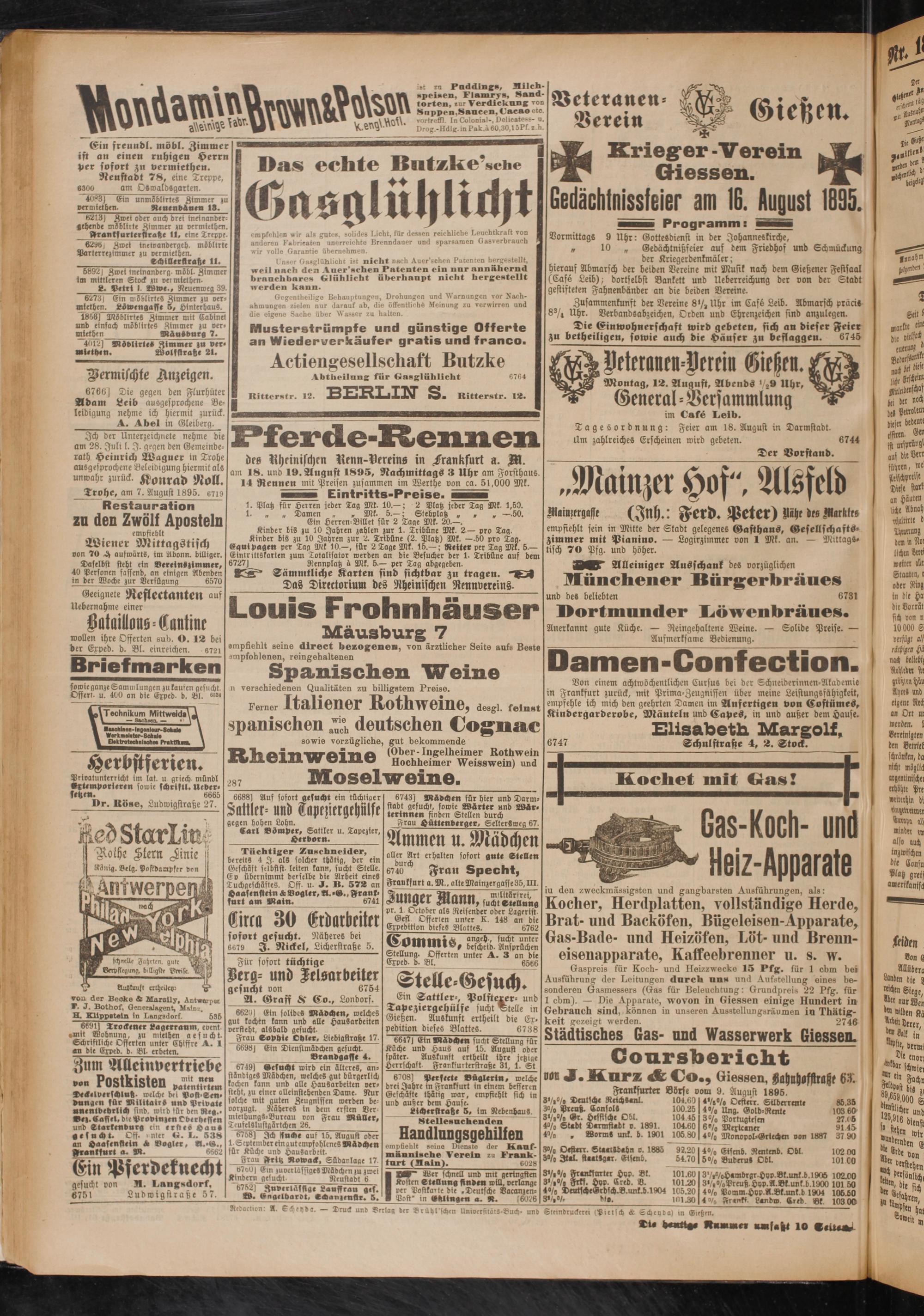 Gaspreis für Koch- und Heizzwecke 15 Pfg. für 1 cbm bei Ausführung der Leitungen durch udn und Aufstellung eines besonderen Gasmessers (Gas für Beleuchtung: Grundpreis 22 Pfg. für 1 cbm). — Die Apparate, wovon in Giessen einige Hundert in gebrauch sind, können in unseren Ausstellungsräumen in Thätig- ieit gezeigt werden. 2746