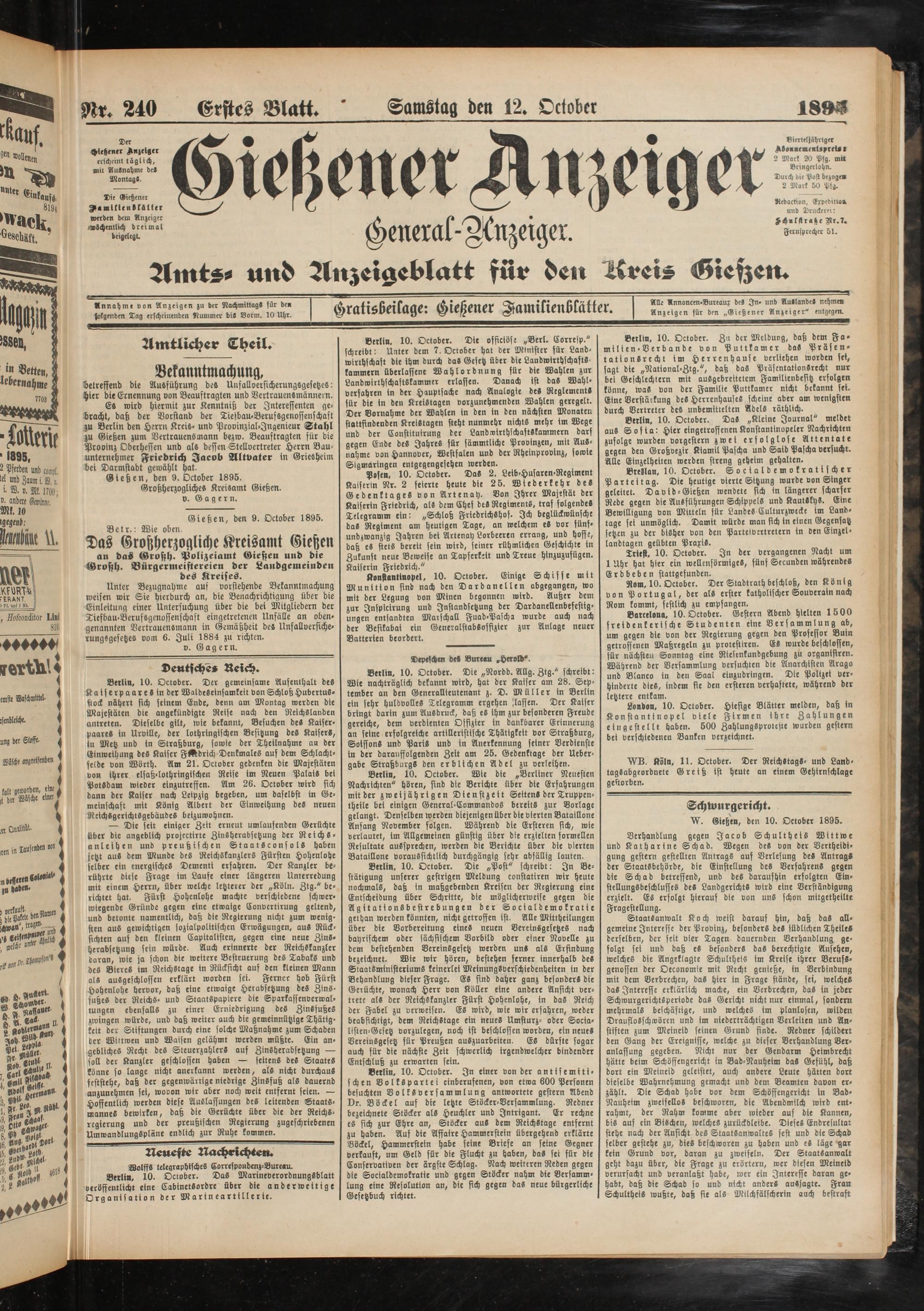 Rr. 240 Erstes Blatt. " Samstag dm 12. Cdobcr 18M
