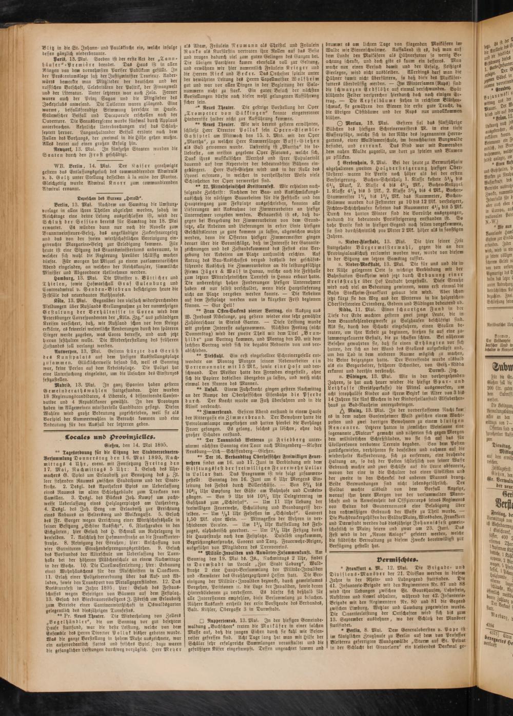 ♦* Tagesordnung für die Sitzung der Stadtverordneten- Versammlung Donnerstag den 16. Mat 1895, Nachmittags 4 Uhr, event. mit Fortsetzung Freitag den 17. Mai, Nachmittag» 5 Uhr: 1. Gesuch deS Uhrmacher» G. Spies um Erlaubniß zur Benutzung deS z. Zt. leer stehenden Raume» zwischen Stadtthurm und der Stadt- kirche. 2. DeSgl. de» Apotheker» Spie» um Ueberlaffung eine» Raume» im alten Schloßgebäude zum Trocknen von Camtllen. 3. DeSgl. de» Bäcker» Joh. Kumpf um pachtweise Ueberlaffung eine» Holzlagerplatzes am Lutherberg. 4. DeSgl. de» Joh. Seng um Erlaubniß zur Errichtung eines Anbaues an SelterSweg und Wolkengaffe. 5. Gesuch deS Fr. Borger wegen Errichtung einer WirthschaftShalle in seiner Besitzung „Schöne Aussicht". 6. Fluthgraben in den Sichgärten- hier Gesuch des H. Schmall um Rohrlegung in denselben. 7. Anschluß der Hofmannstraße an die Frankfurter- straße. 8. Reinigung der Straßen- hier: Anschaffung von vier Garnituren StraßenbesprengungSgeräthen. 9. Gesuch de» Vorstände» der Aliceschule um Ueberlaffung der Turn- Halle bet der höheren Mädchenschule an einem Nachmittage in der Woche. 10. Die Quellwasserleitung- hier: Erbauung eines WohnhäuSchenS für den Maschinisten in Queckborn. 11. Erlaß einer Polizeiverordnung über daS Auf- und Ab- laden, sowie den Transport von Metallgegenständen. 12. DaS Kreisturnfest im Jahre 1895. hier: Gesuch deS FestauS- fchuffeS wegen Beseitigen von Bäumen auf dem Festplatz. 13. Gesuch deS Bierbrauereibesitzers I. Förtsch um Erlaubniß zu« Betriebe einer Cantinenwirthschaft in OSwaldögarten gelegentlich des diesjährigen Turnfestes.