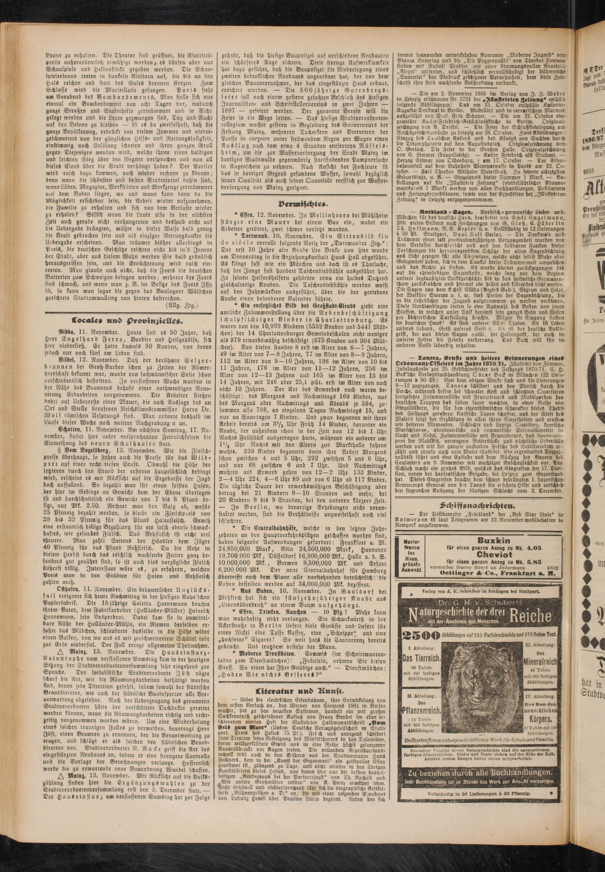 gehabt, baß die hiesige Baupolizei auf verschiedene Neubauten ein schärferes Auge richtete. Diese strenge Aufmerksamkeit hat dazu geführt, daß die Baupolizei die Ntederlegung eines zweiten bedenklichen Neubaues angeordnet hat, der von dem gleichen Bauunternehmer, der das eingestürzte HauS erbaut, errichtet worben. — Die 500jährige Gutenbergs» feier soll nach einem gestern gefaßten Beschluß beS hiesigen Journalisten» unb SchriftstelleroereinS in zwei Jahren — 1897 — gefeiert werben. Der genannte Verein will bie Feier in die Wege leiten. — DaS hiesige Stadtverordneten» collegium machte gestern in Begleitung des Gouverneurs der Festung Mainz, mehreren Technikern unb Vertretern der Presse in corpore unter strömendem Regen per Wagen einen Ausflug nach dem etwa 4 Stunden entfernten Rüffels» heim, um die zur Wafferverforgung ber Stadt Mainz im dortigen Stabtwalde gegenwärtig stattfindenden Pumpverfuche in Augenschein zu nehmen. Nach Ansicht der Fachleute ist das in dortiger Gegend gefundene Waffer, sowohl bezüglich seiner Qualität als auch seiner Quantität trefflich zur Waffer» Versorgung von Mainz geeignet.