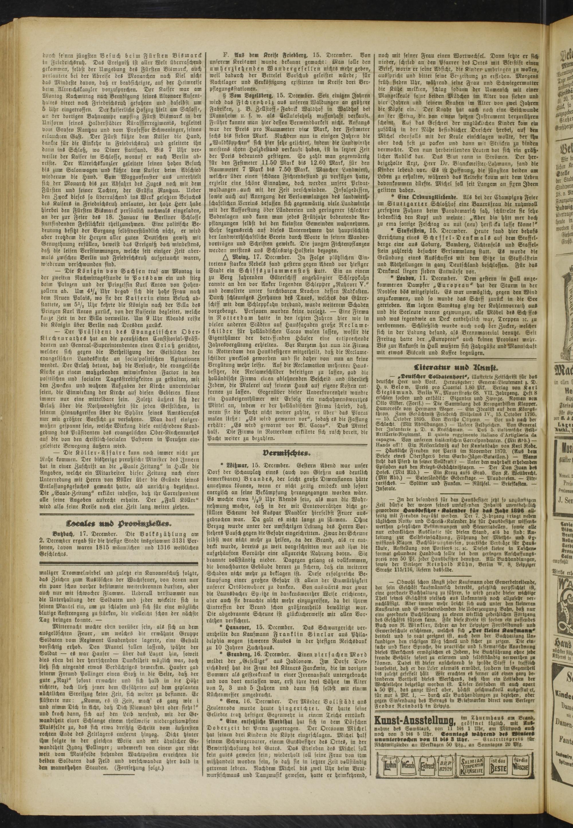 Butzbach, 17. December. Die Volkszählung am 2. December ergab für die hiesige Stadt inSgrsammt 3131 Personen, tQüon waren 1815 männlichen und 1316 weiblichen Geschlechts.