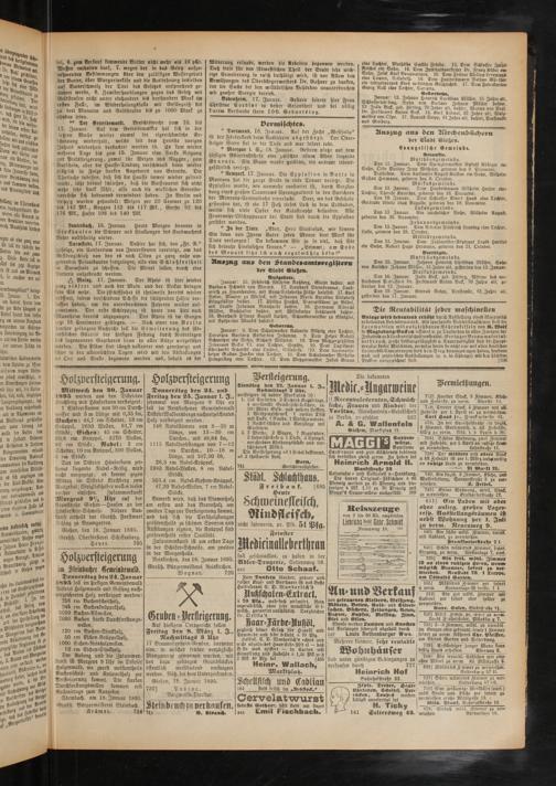 Januar: 3. Dem Schuhmacher Valentin Röhrig eine Tochter, Dorothea Barbara Katharina Johanna. 9. Dem Heizer Rudolf Schweitzer ein Sohn, Richard Wilhelm. 10. Dem Metzgergehülsen Johannes Becker VI. eine Tochter, Sophie, 10. Dem Taglöhner Eberhardt Schmidt eine Tochter, Elisabeth. >10. Dem Locomotio- heizer Gustav Junker eine Tochter. 11. Dem Schuhmacher Wilhelm Hetnzerling eine Tochter. 12. Dem Metzgermeister Jakob Braun