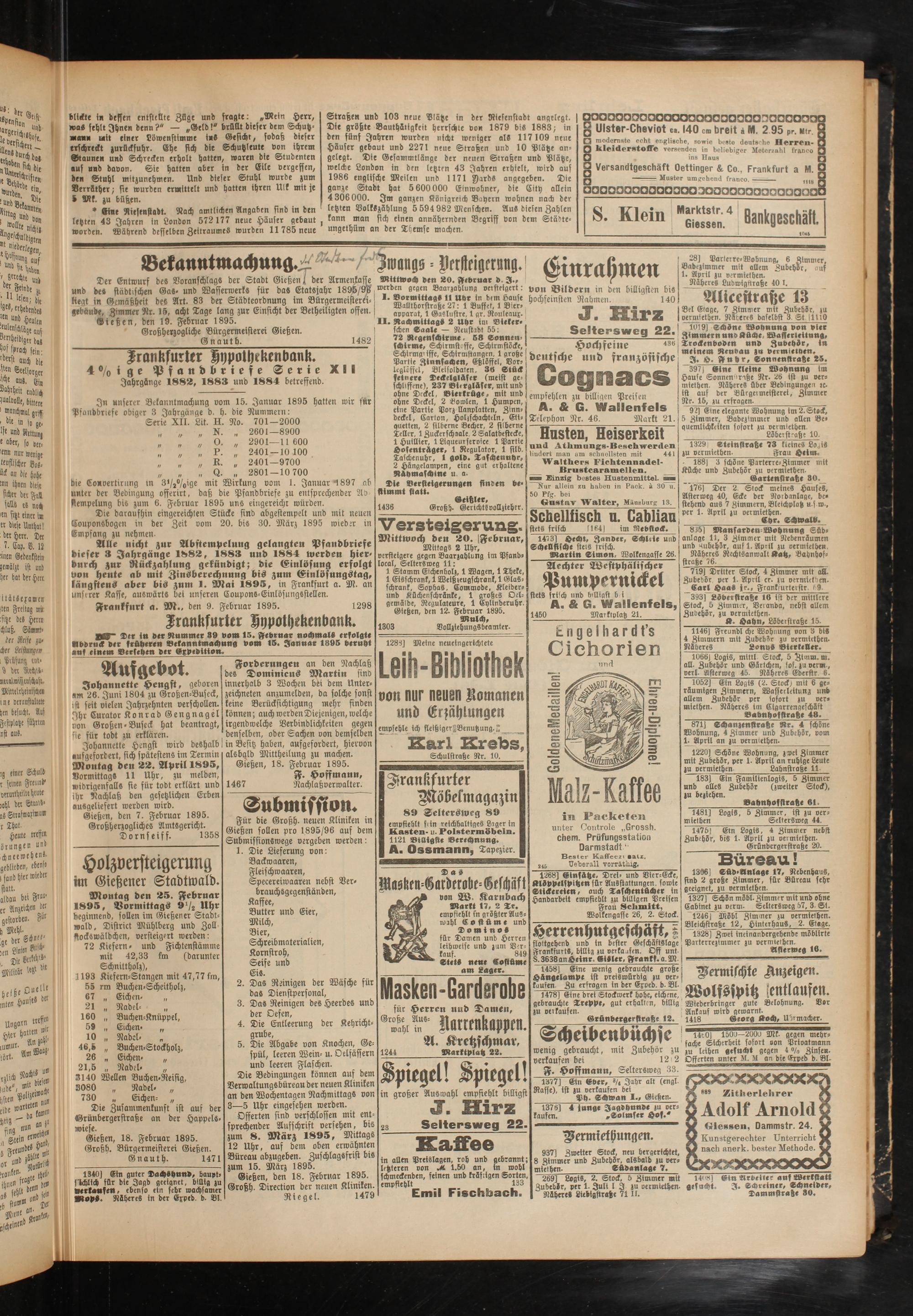 1 Stamm Eichenbolz, 1 Wagen, 1 Theke, 1 Eisschrank, 1 Weißzeugschrank, 1 Glasschrank, Sophas, Commode, Kleiderund Küchenschränke, 1 großes Oel- gemälde, Regulateure, 1 Cylinderuhr. Gießen, den 12. Februar 1895.