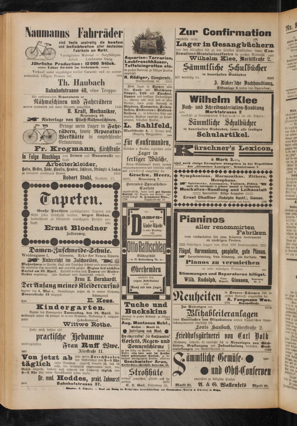 Beginn des Kindergarten Donnerstag, den IS. April. An Buckskins Meldungen nehme ich jederzeit in meiner Wohnung, Westanlage 9, entgegen.I offeriren in großer Auswahl zu billigen 8460 Hochachtungsvoll dreist n 2966