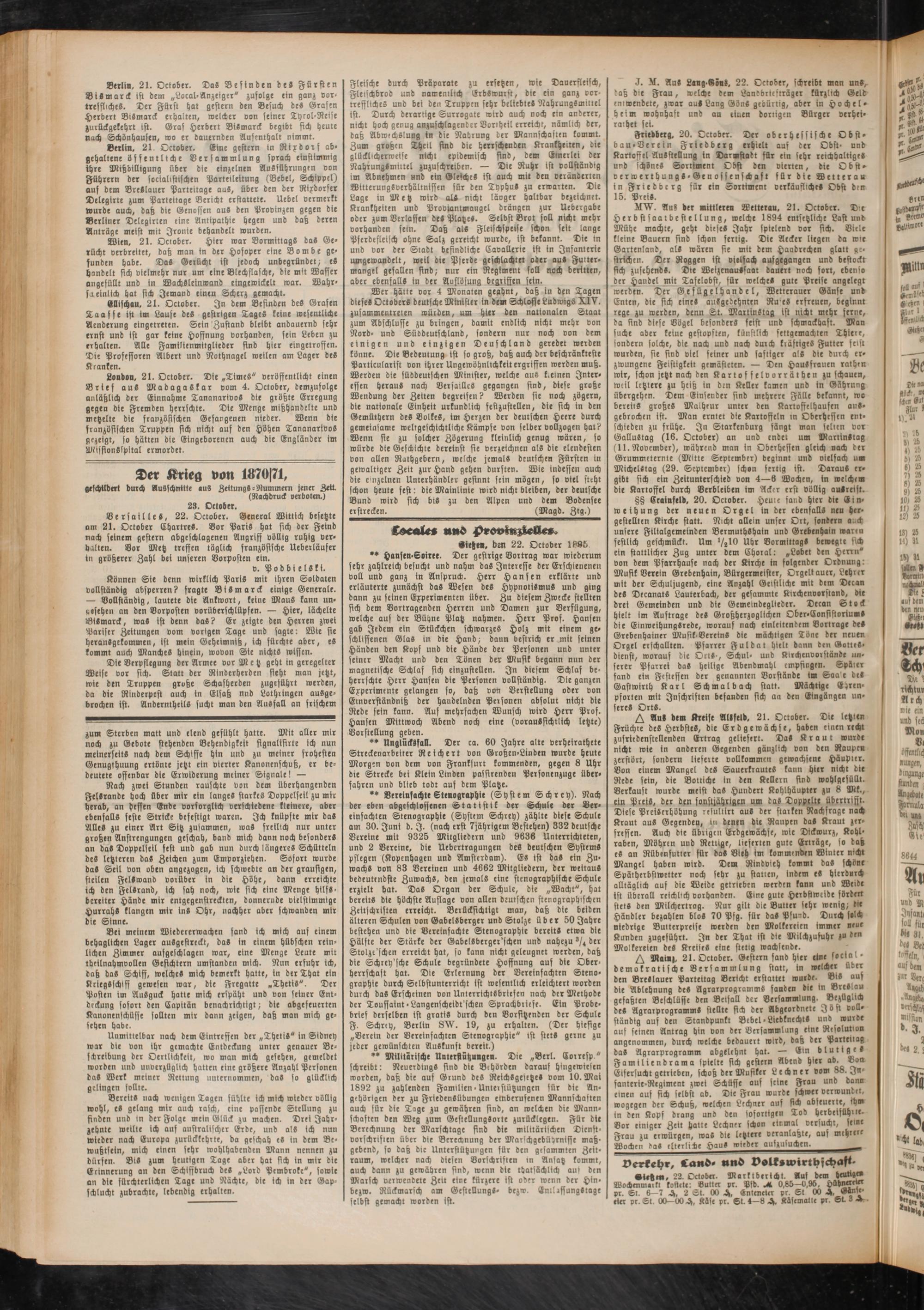 Versailles, 22. October. General Wittich besetzte am 21. October ChartreS. Bor Paris hat sich der Feind nach seinem gestern abgeschlagenen Angriff völlig ruhig verhalten. Vor Metz treffen täglich französische Ueberläufer in größerer Zahl bei unseren Vorposten ein.