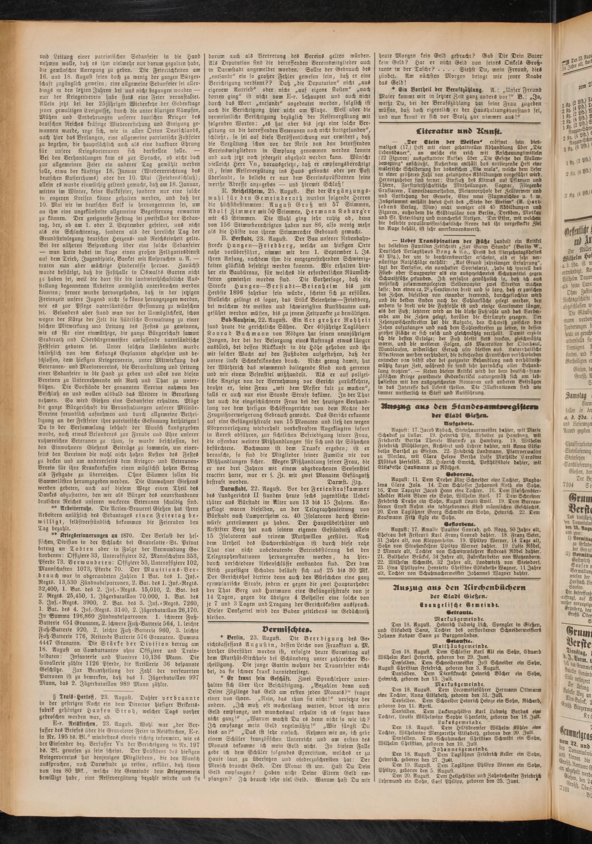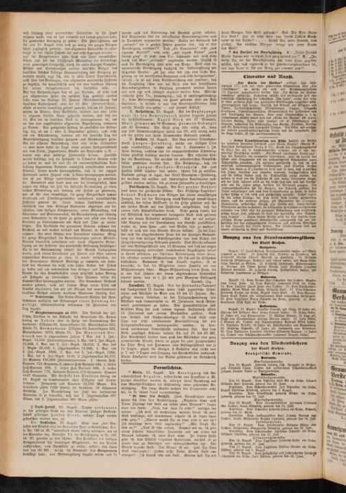 August: 17. Jacob Atzbach, Steinhauermeister dahier, mit Marie Schadeck zu Lollar. 19. Heinrich Pitz, Arbeiter zu Hamburg, mit Friederike Bertha Therese Warncke zu Hamburg. 19. Wilhelm Friedrich Mühlberger, Architrct und Lehrer dahier, mit Anna Elisa- betha Barthel zu Gießen. 22. Friedrich Landmann, Psarroerwalter zu Merlau, mit Clara Helene Bertha Luise Mathilde Caroline MöbiuS Hierselbst. 23. Heinrich Emrich, PosthilfSboie dahier, mit Elisabethe Hausmann zu Röthges.