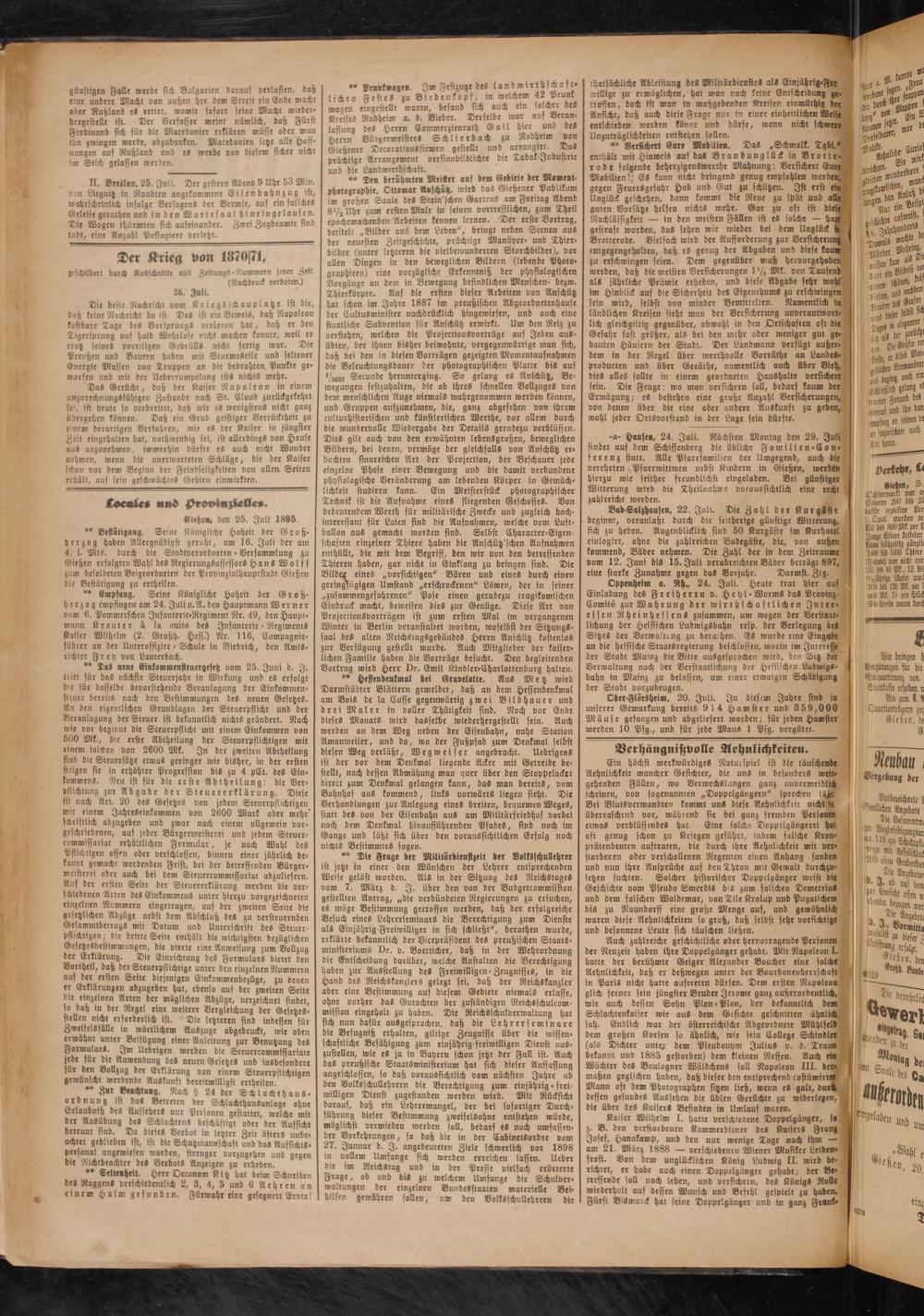 Die beste Nachricht vom Krieg-ichauplatze ist die, daß keine Nachricht da ist. Da- ist ein Beweis, daß Napoleon kostbare Tage des BorspruvgS verloren hat, daß er den Tigersprung auf halb Wehrlose nicht machen konnte, weil er trotz seineß voreiligen Gebrülls nicht fertig war. Die Preußen und Bayern haben mit SturmeSeile und seltener Energie Massen von Truppen an die bedrohten Punkte ge* warfen und mir der Ueberrumpelung istS nichts mehr.