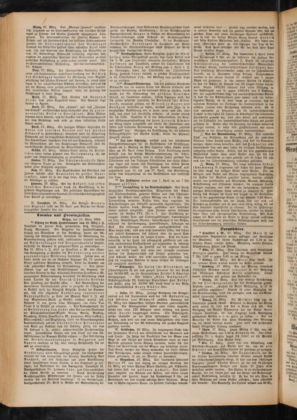 -8- Lollar, 28. März. Zufolge Anregung beß Krieger- Vereins unb beß Turnvereins wirb ber 80. Geburtstag beß Fürsten von Bißmarck nächsten Sonntag ben 31. März von fämmtlichen hiesigen Vereinen gemeinschaftlich gefeiert. Die Gesangvereine haben zwei Lieder eingeübt, welche von circa 125 Sängern unter Leitung beß Herrn Lehrer Jacobi vorgetragen werben. Die Schuljugenb, welche ebenfalls an ber Feier theilnehmen soll, erhält Bretzeln, auch wirb vor bem neuen Schulgedäube eine Linde zur Erinnerung an den 80. Geburtstag des großen Kanzlers gepflanzt werben.