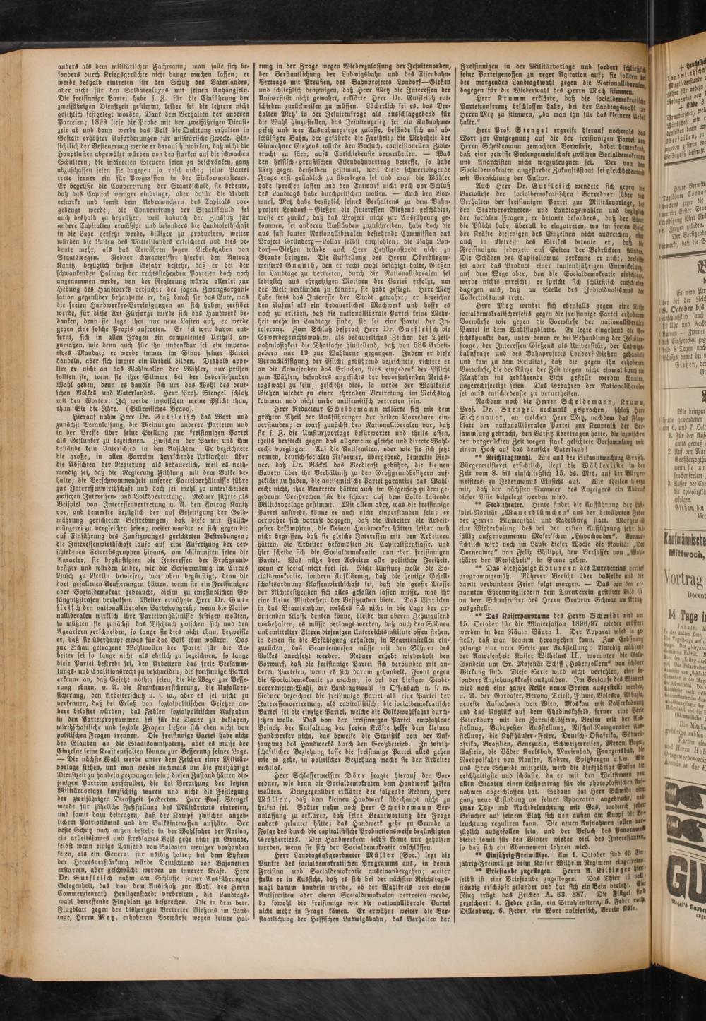 Herr Landtag-abgeordneter Müller (Soc.) legt die Punkte des socialdemokratischen Programm- au-, in denen Freisinn und Socialdemokratie auseinandergehen; weiter stellt er in Aussicht, daß eS sich bei der nächsten Reichstag-« Wahl darum handeln werde, ob der Wahlkreis von eine« Antisemiten oder einem Socialdemokraten vertreten werde, da sowohl die freisinnige wie die nationalliberale Partei nicht mehr in Frage kämen. Er erwähnt weiter die Ber« staatlichung der Hesfischen LudwtgSbahn, da- Verhalten der