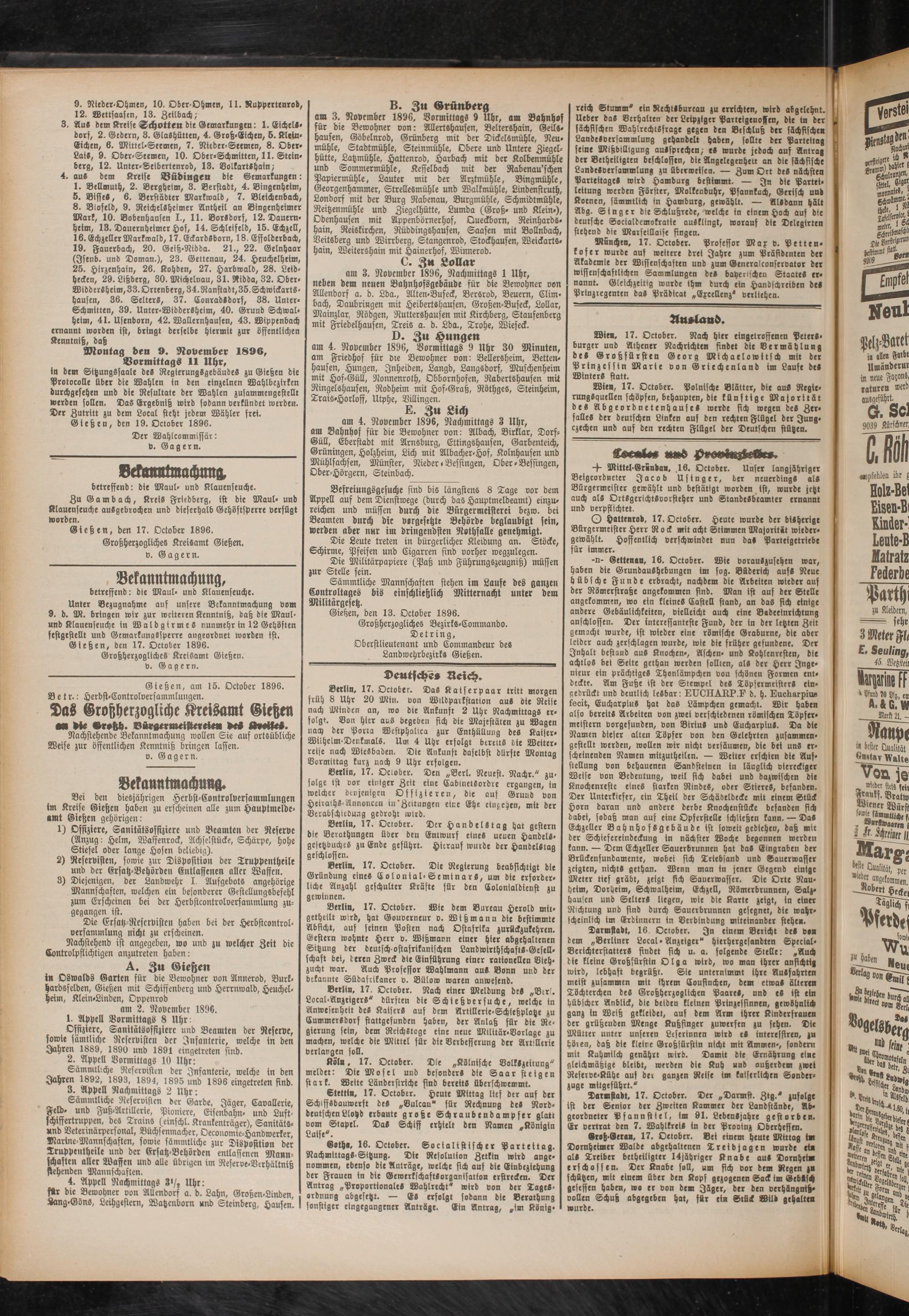 Gießen, den 17. October 1896. Großherzogliches Kreisamt Gießen, v. Gagern.