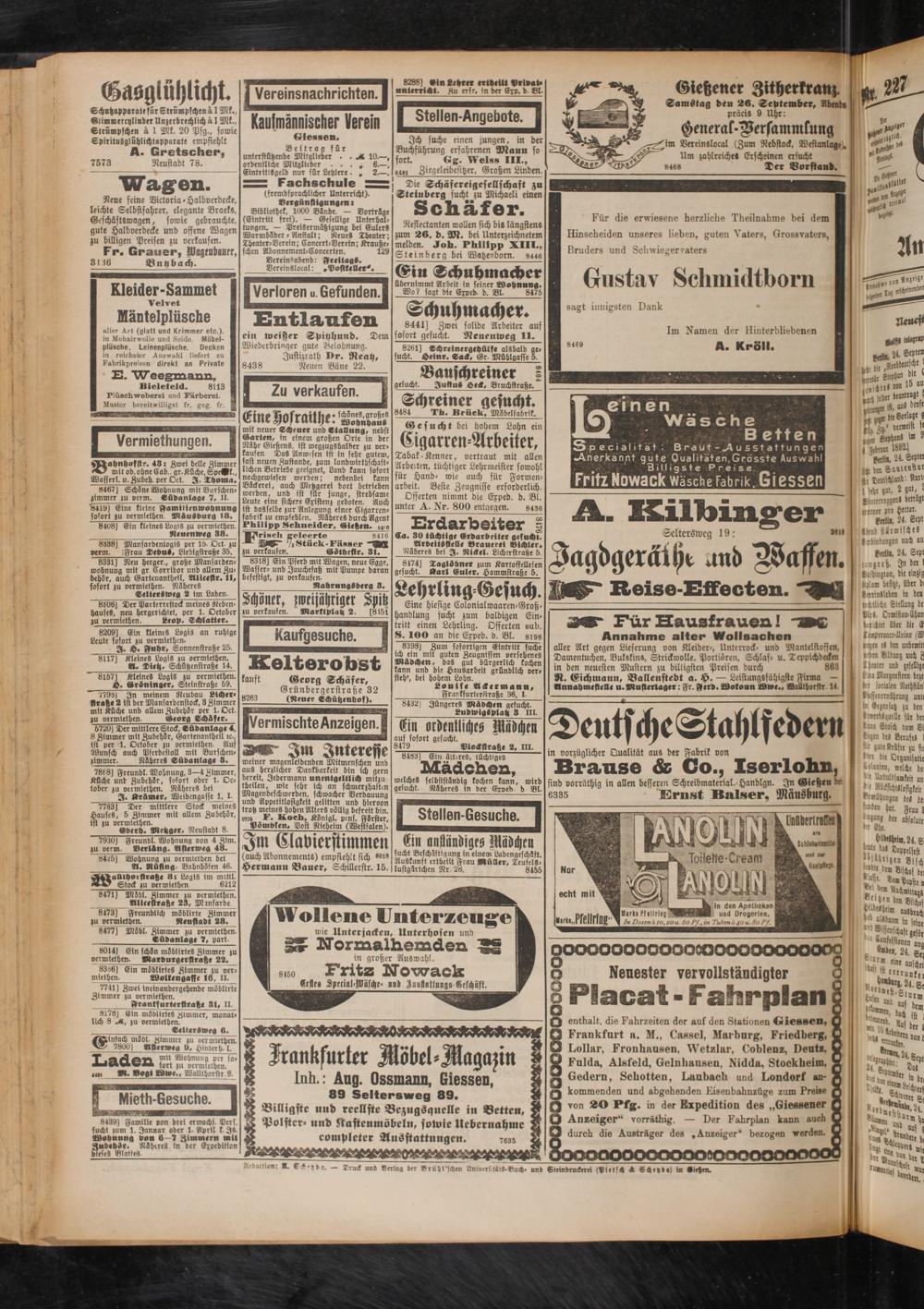 o Neuester vervollständigter g Placat - Fahrplan Q enthalt, die Fahrzeiten der auf den Stationen Giessen, Q Frankfurt a. M., Cassel, Marburg, Friedberg, Q Lollar, Fronhausen, Wetzlar, Coblenz, Deute. Q Fulda, Alsfeld, Gelnhausen, Nidda, Stockheim, g Gedern, Schotten, Laubach und Londorf an- q kommenden und abgehenden Eieenbahnzüge zum Preise Q von 20 Pfg. in der Expedition des „Giessener Q Anzeiger“ vorräthig. — Der Fahrplan kann auch O durch die Austräger des „Anzeiger“ bezogen werden.