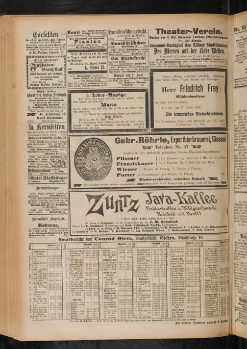 Coursbericht von Conrad Pietz, Bankgeschäft, Gießen, Schulstraße 10