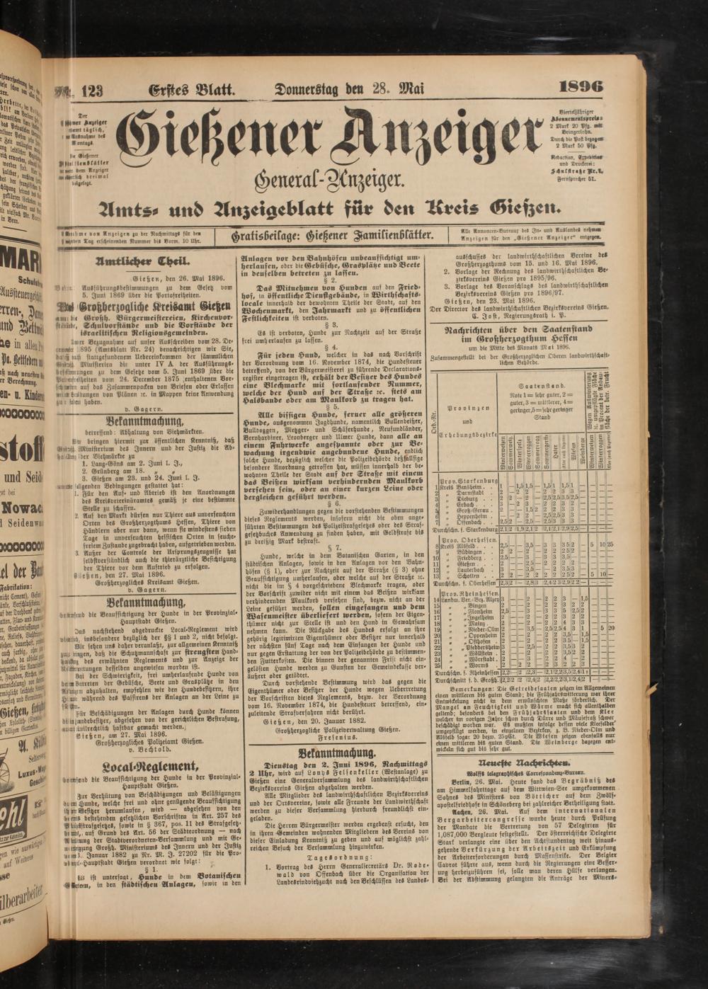 ssLr Beschädigungen der Anlagen durch Hunde können diituhwadebefitzer, abgesehen von der gerichtlichen Bestrafung, . «vus.^ilrechtlich haftbar gemacht werden., Ließen, am 27. Mai 1896.
