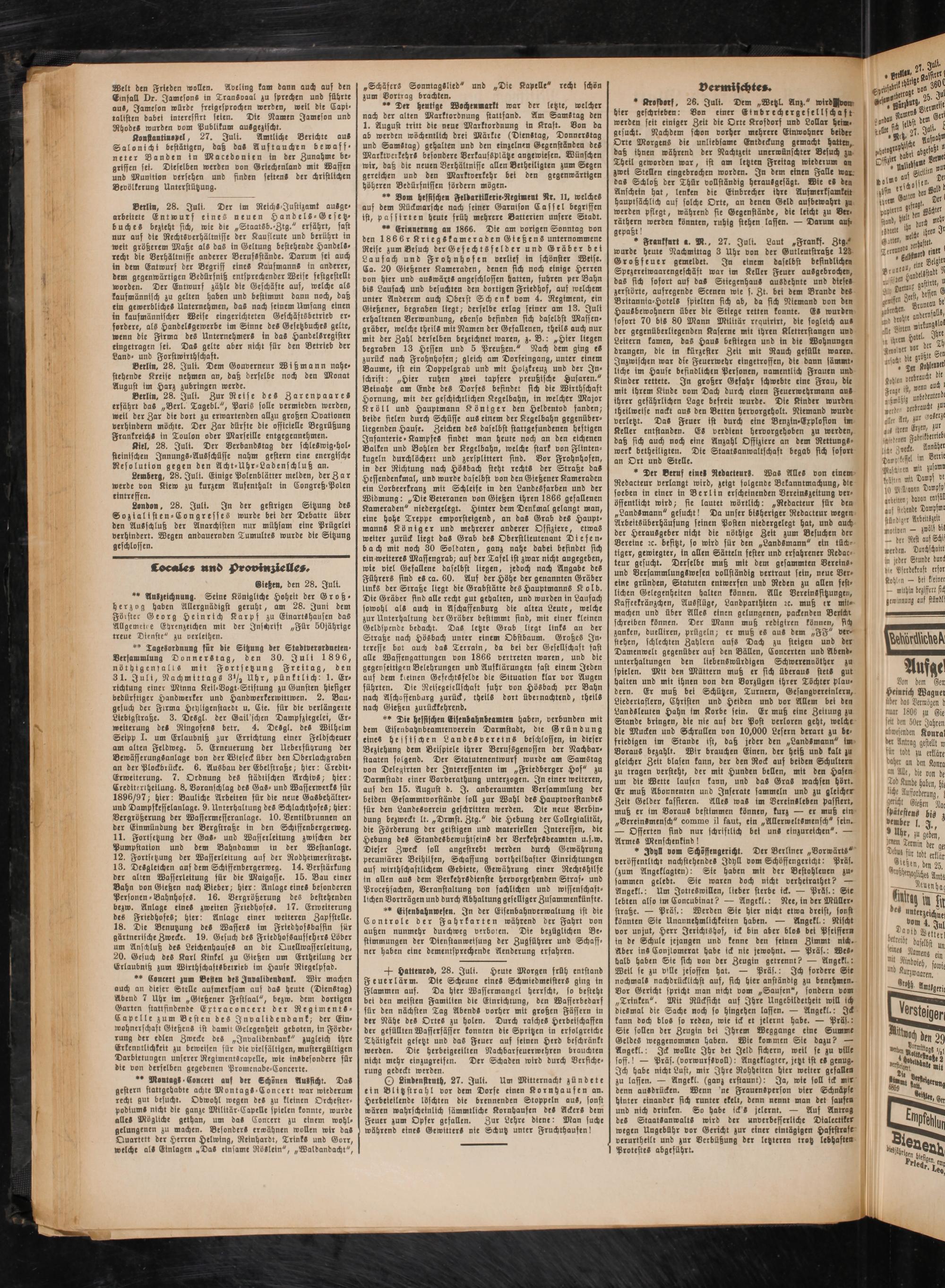 ** Tagesordnung für die Sitzung der Stadtverordneten- Versammlung Donnerstag, den 30. Juli 189 6, nöthigenfalls mit Fortsetzung Freitag, den 31. Juli, Nachmittags 3^/z Uhr, pünktlich: 1. Errichtung einer Minna Keil-Vogt Stiftung zu Gunsten hiesiger bedürftiger Handwerker und Handwerkerwittwen. 2. Baugesuch der Firma Heyltgenstaebl u. Cie. für die verlängerte Ltebtgstraße. 3. DeSgl. der Gail'schen Dampfziegelei, Erweiterung det Ringofens betr. 4. DeSgl. des Wilhelm Seipp I. um Erlaubntß zur Errichtung einer Feldscheuer am alten Feldweg. 5. Erneuerung der Ueberführung der BewäfferungSanlage von der Wieseck über den Oberlachgraben an der Plockbrücke. 6. Ausbau der Ebelstraße- hier: Credit- Erweiterung. 7. Ordnung deS städtischen Archivs- hier: Ereditrrtheilung. 8. Voranschlag deS GaS- und WafferwerkS für 1896/97- hier: Bauliche Arbeiten für die neue GaSbehälter- und Dampfkesselanlage. 9. Unterhaltung deS TchlachthofeS- hier: Vergrößerung der Waffermefferanlage. 10. Ventilbrunnen an der Einmündung der Bergstraße in den Schtffenbergerweg. 11. Fortsetzung der GaS- und Wasserleitung zwischen der Pumpstation und dem Bahndamm in der Westanlage. 12. Fortsetzung der Wafferletrung auf der Rodheimerstratze. 13. Desgleichen auf dem Schiffenbergerweg. 14. Verstärkung der alten Wasserleitung für die Matgaffe. 15. Bau einer Bahn von Gießen nach Bieber- hier: Anlage eines besonderen Personen-Bahnhofes. 16. Vergrößerung des bestehenden bezw. Anlage eines zweiten Friedhofes. 17. Erweiterung des Friedhofes; hier: Anlage einer weiteren Zapfstelle. 18. Die Benutzung deS WafferS im FriedhofSbaffin für gärtnerische Zwecke. 19. Gesuch deS Friedhofsaufsehers Löber um Anschluß deS Leichenhauses an die Quellwasserleitung, 20. Gesuch des Karl Kinkel zu Gießen um Ertheilung der Erlaubntß zum WirthschastSbetrieb im Hause Rtegelpfad.