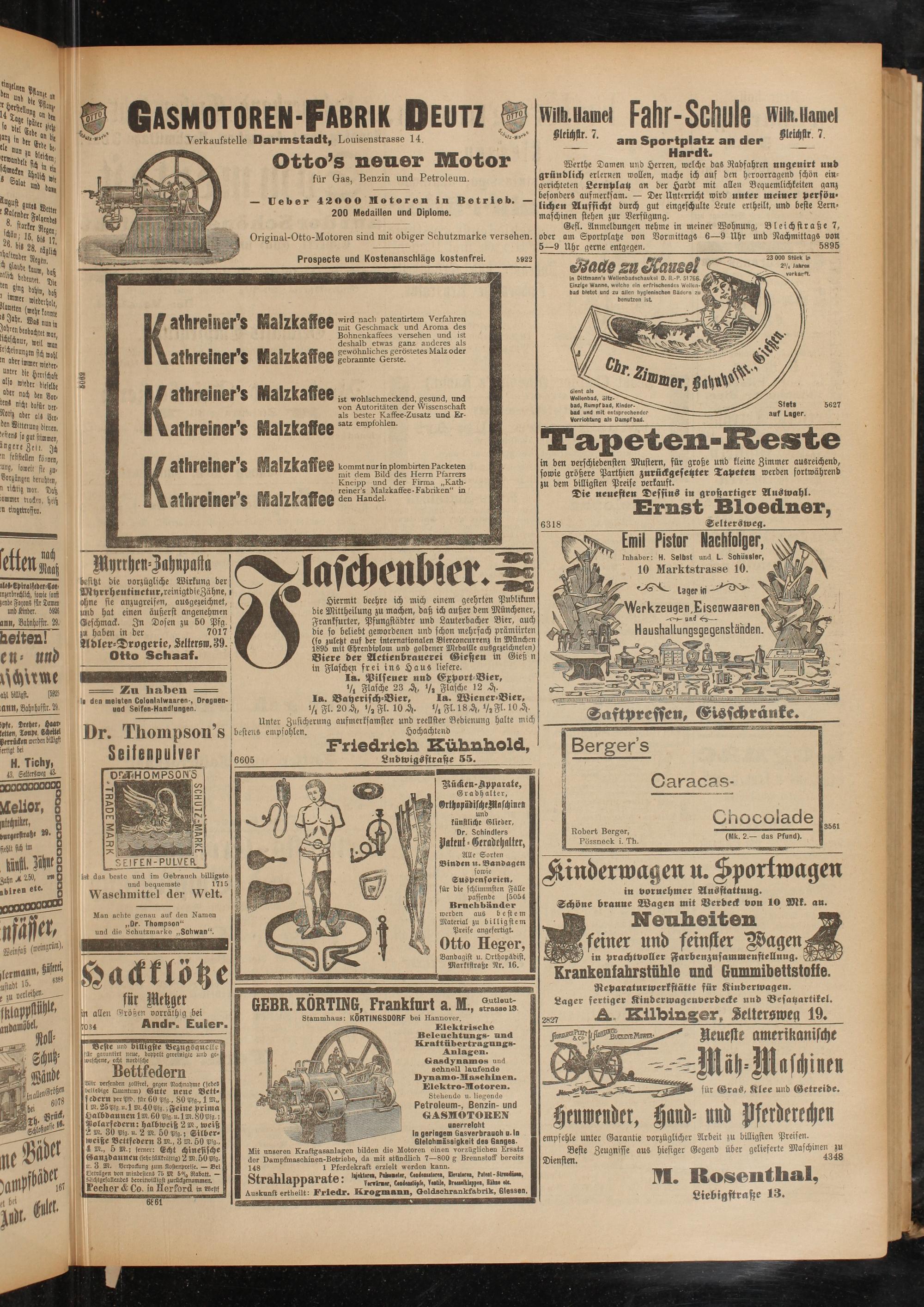 Frankfurter, Pfungstädter und Lauterbacher Bier, auch die so beliebt gewordenen und schon mehrfach prämiirten (so zuletzt auf der internationalen Bierconcurrenz in München 1895 mit Ehrendiplom und goldener Medaille ausgezeichneten) Biere der Aetienbrauerei Gießen in Gieß n in Flaschen frei ins Haus liefere.