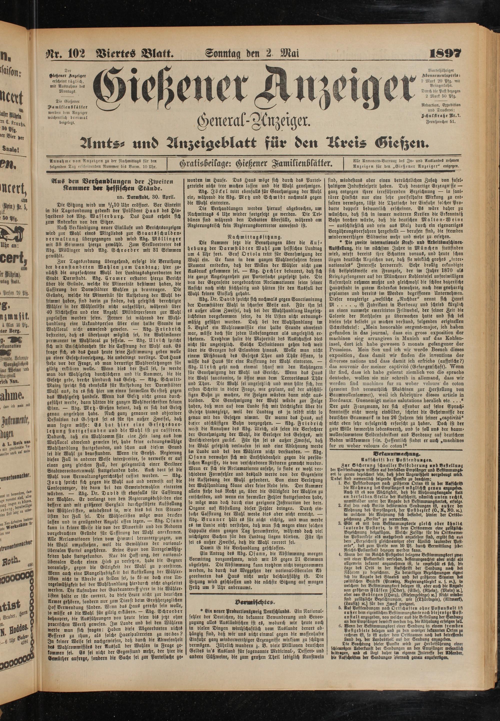 Vierteljähriger Abonnementspreis i 2 Mark 20 Pfg. mit Bringerlohn. Durch die Post bezogen 2 Mark 50 Pfg.
