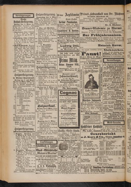 Eichenstämme mit 113,21 fm, darunter schönes Schnittholz bis zu 57 cm Durchm., Birkenstamm mit 0,42 fm, Nadelstämme mit 31,97 fm, Nadelstangen mit 6,50 fm, rm Buchen-Scheitholz, „ Eichen- „ Buchen-Knüppelholz, „ Eichen- »