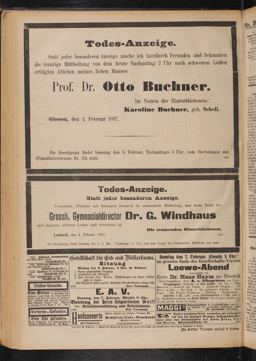 Die Beerdigung findet Sonntag den 7. d. Mts., Vormittags 11 Uhr, von dem Portal des Darmstädter Friedhofs aus statt.