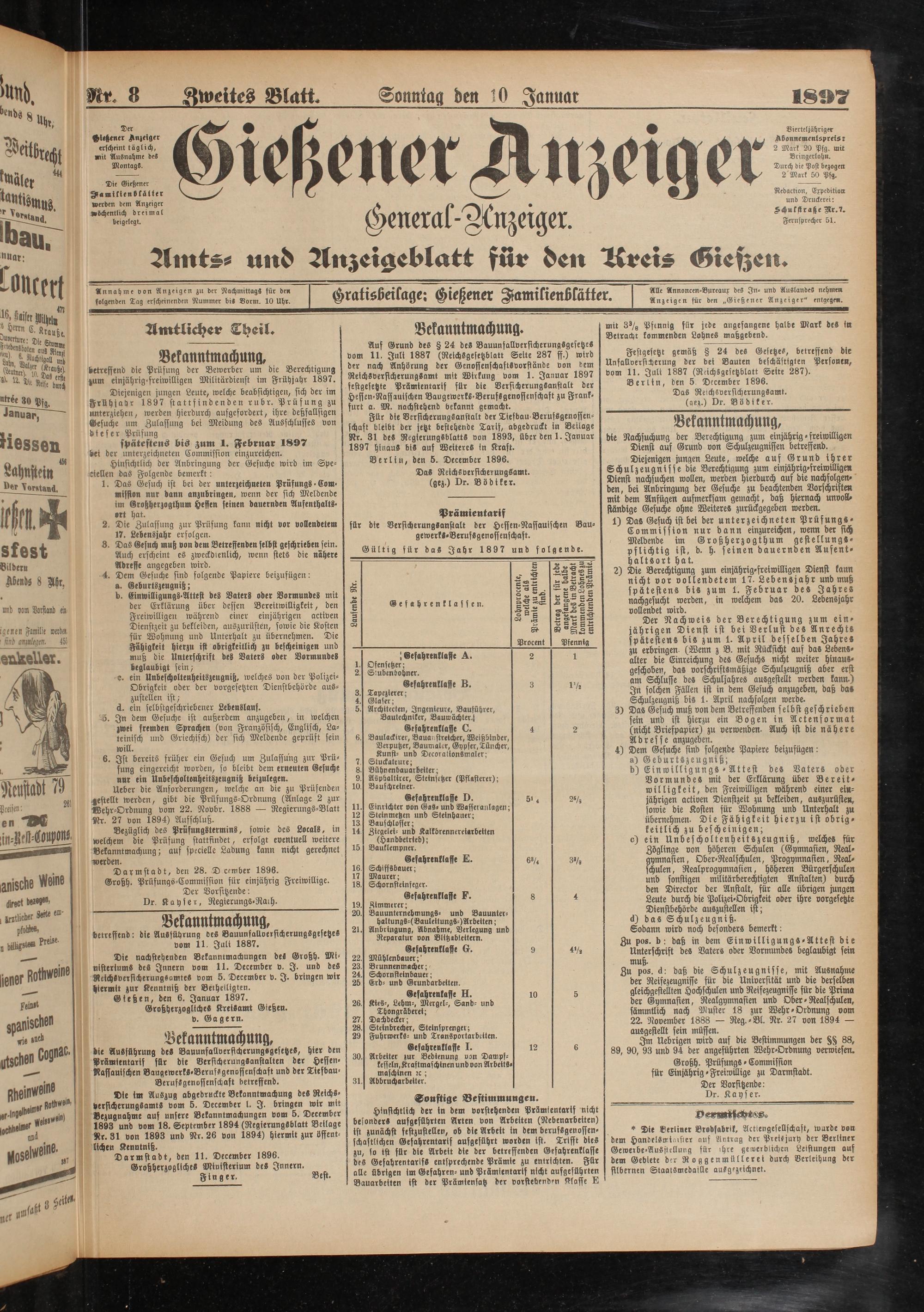 Auf Grund des § 24 deS Bauunfallversicherungsgesetzes vom 11. Juli 1887 (Reichsgesetzblatt Seite 287 ff.) wird der nach Anhörung der GenoffenschaftSvorstände von dem ReichSverficherungSamt mit Wirkung vom 1. Januar 1897 festgesetzte Prämientarif für die Versicherungsanstalt der Heffen-Naffauifchen BaugewerkS-BerufSgenoffenschaft zu Frankfurt a. M. nachstehend bekannt gemacht.