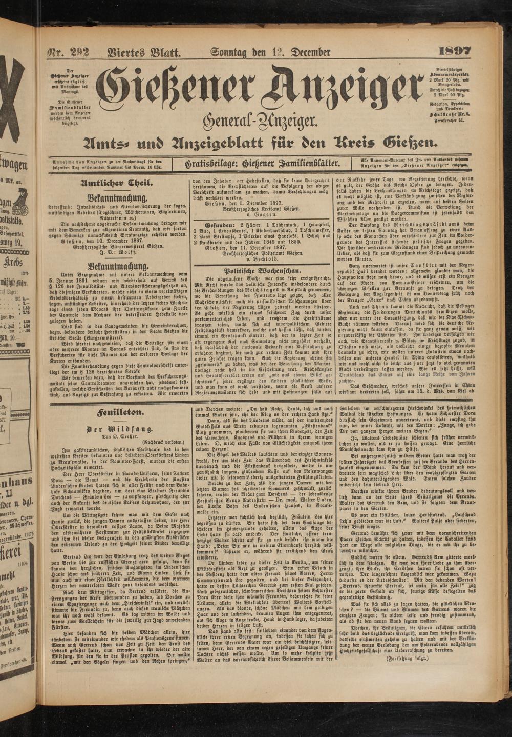 Gießen, den 1. December 1897. Großherzogliches Kreisamt Gießen.
