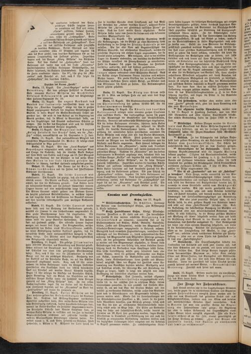 * * Reserveoffiziere bei der Kaiserparade. Durch verschiedene BezirkScommandoS wird die folgende Weisung bekannt gegeben: Offiziere des Beurlaubtenstandes, welche der am 4. September bei Homburg v. d. H. ftattfindenden Parade als Zuschauer beiwohnen wollen, stellen sich link» seitwärts der zwischen der Straßengabel östlich Niedereschbach errichteten Zuschauer-Tribüne auf. 9 Uhr 30 Miu. Vorm. müssen die Plätze eingenommen sein.