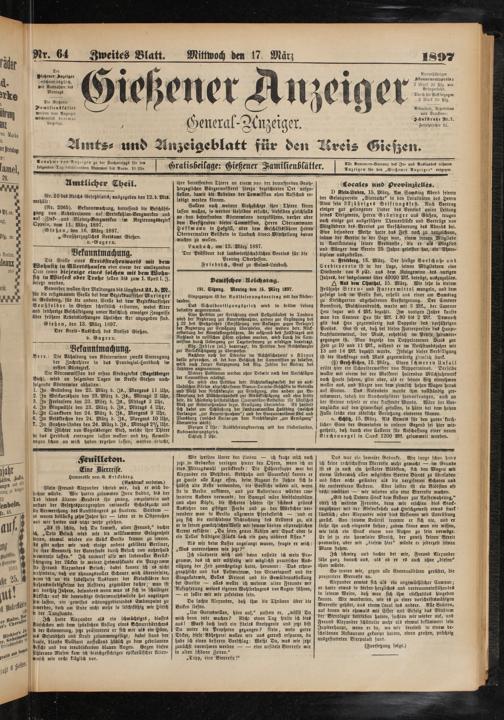 Die Gießener Ka milien ö tätter Verden dem Anzeiger Svöchentlich dreimal beigelegk.