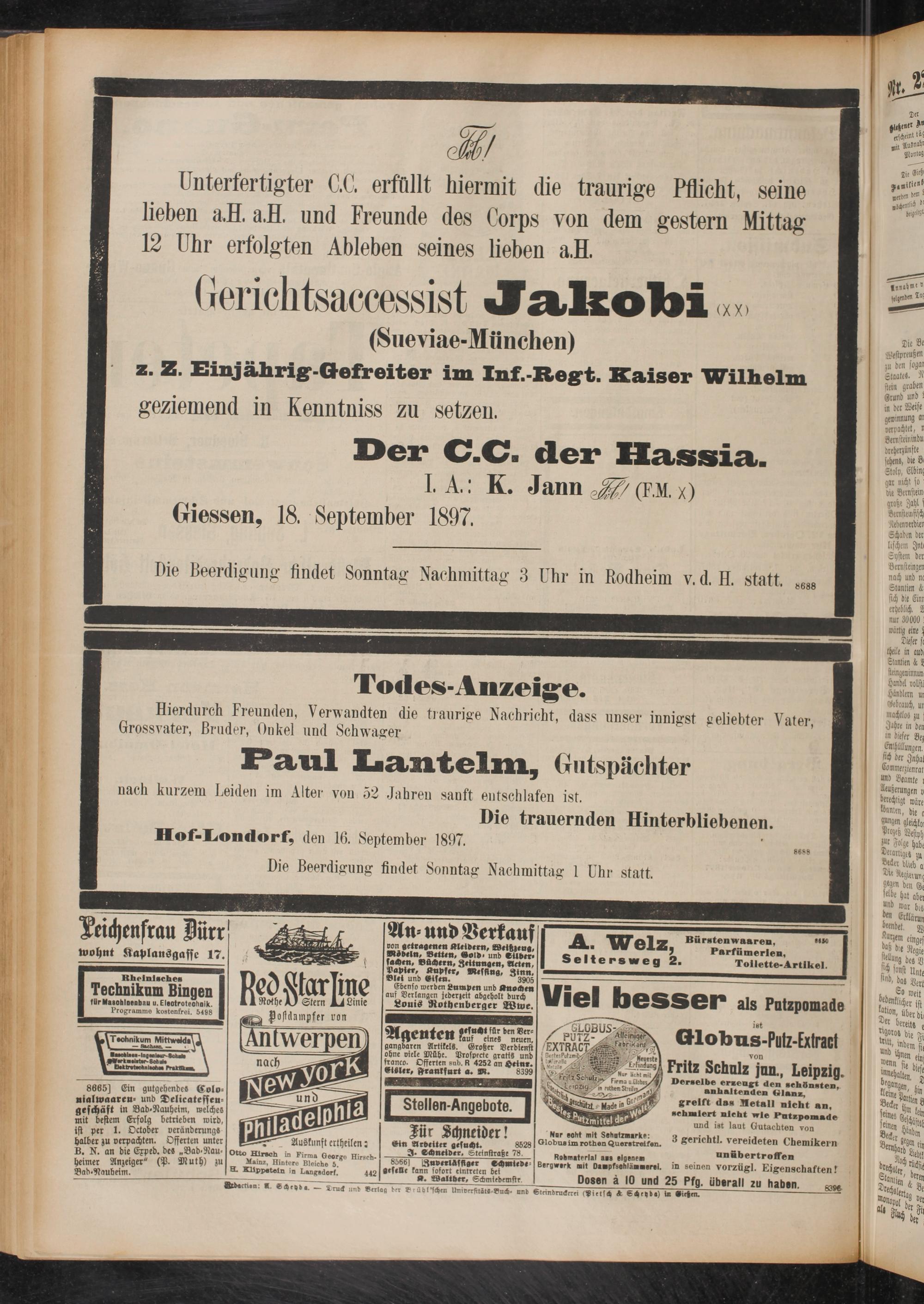 Unterfertigter C.C. erfüllt hiermit die traurige Pflicht, seine lieben a.H. a.H. und Freunde des Corps von dem gestern Mittag 12 Uhr erfolgten Ableben seines lieben a.H.
