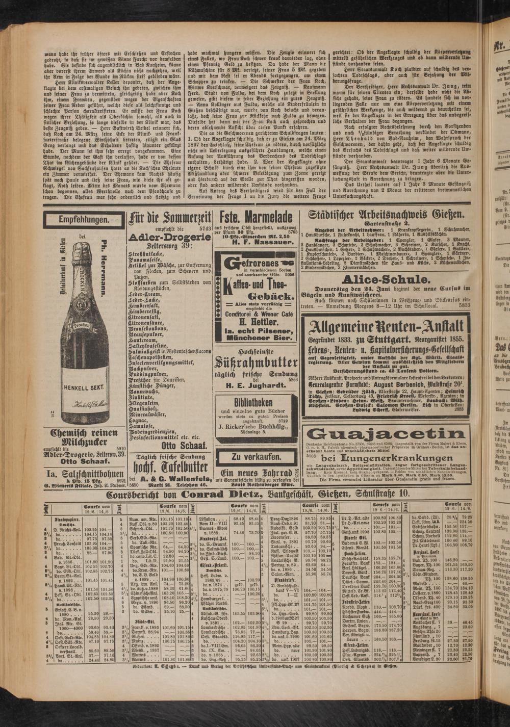 Coursbericht don Conrad Dietz, Bankgeschäft, Gießen, Schnlstraße 10.