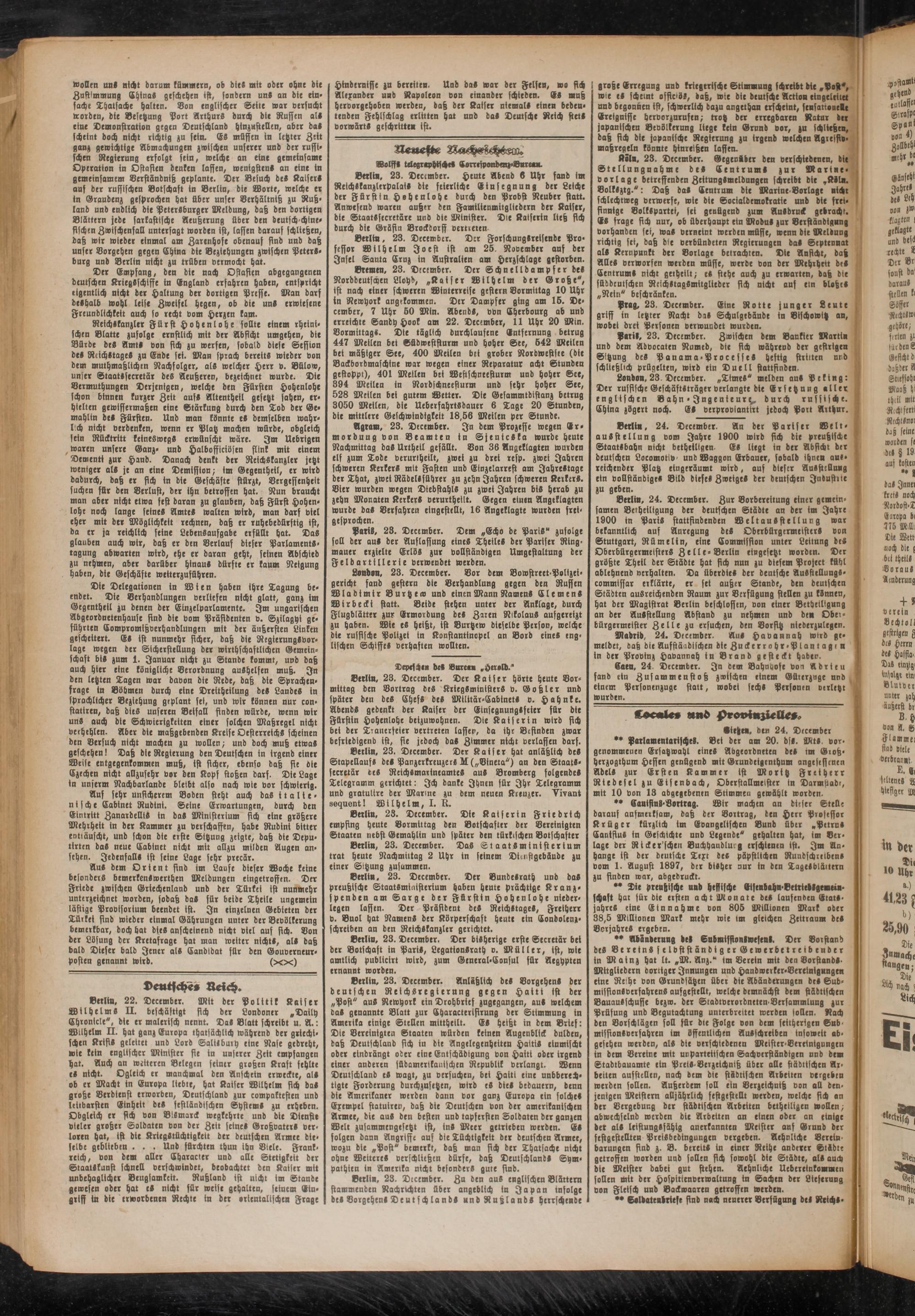 Berlin, 23. December. Der Kaiser hörte heute Vormittag den Vortrag des KriegSministerS v. Goßler und später den des Chef» de» Militär-Cabinet» o. Hahnke. Abends gedenkt der Kaiser der EinsegnungSfeier für die Fürstin Hohenlohe beizuwohnen. Die Kaiserin wird fich bei der Trauerfeier vertreten lassen, da ihr Befinden zwar befriedigend ist, fie jedoch da» Zimmer nicht verlassen darf.