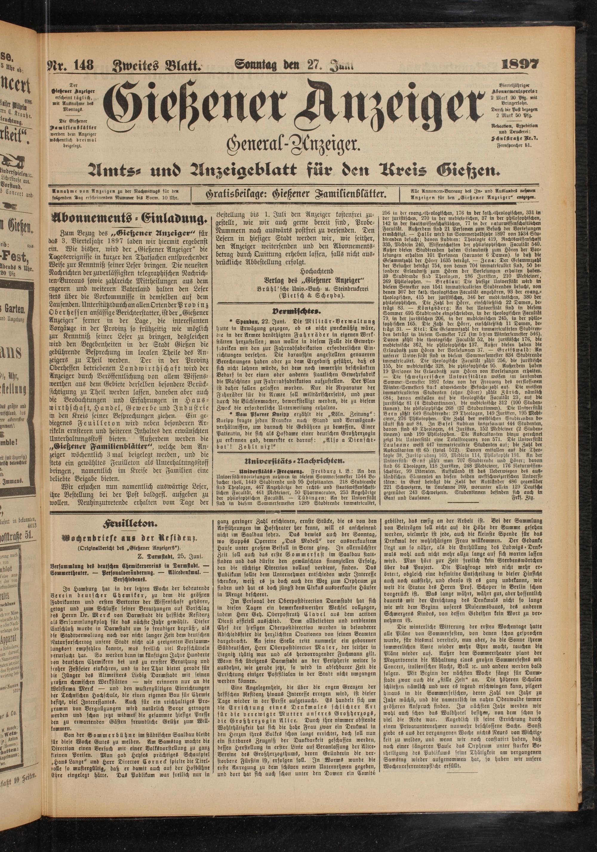 Zum Bezug des „Gietzener Anzeiger" für das 3. Vierteljahr 1897 laden wir hiermit ergebenst ein. Wie bisher, wird der „Gießener Anzeiger" die Tcigesereignisfe in kurzer den Thatsachen entsprechender Weise zur Kenntniß seiner Leser bringen. Die neuesten Nachrichten der zuverlässigsten telegraphischen Nachrichten-Bureaus sowie zahlreiche Mittheilungen aus dem engeren und weiteren Vaterland halten den Leser stets über die Vorkommnisse in demselben aus dem Laufenden. Unterstütztdurch an allenOrtender Provinz Oberhessen ansässig e Berichterstatter, ist der „ Gießener Anzeiger" ferner in der Lage, die interessanten Vorgänge in der Provinz so fttihzeittg wie möglich zur Kenntniß seiner Leser zu bringen, desgleichen wird den Begebenheiten in der Stadt Gießen die gebührende Besprechung im localen Theile des Anzeigers zu Theil werden. Der in der Provinz Oberhessen betriebenen Landwirthschäft wird der Anzeiger durch Veröffentlichung von allem Wissens- werthen aus dem Gebiete derselben besondere Berücksichtigung zu Theil werden lassen, daneben aber auch die Beobachtungen und Erfahrungen in Haus- wirthschaft, Handel, Gewerbe und Industrie in den Kreis seiner Besprechungen ziehen. Ein gediegenes Feuilleton wird neben besonderen Artikeln ernsteren und heiteren Inhaltes den erwünschten Unterhaltungsstoff bieten. Außerdem werden die „Gietzener Familienblütter", welche dem Anzeiger wöchentlich 3 mal beigelegt werden, und die stets ein gewähltes Feuilleton als Unterhaltungsstoff bringen, namentlich im Kreise der Familien eine beliäte Beigabe bieten.