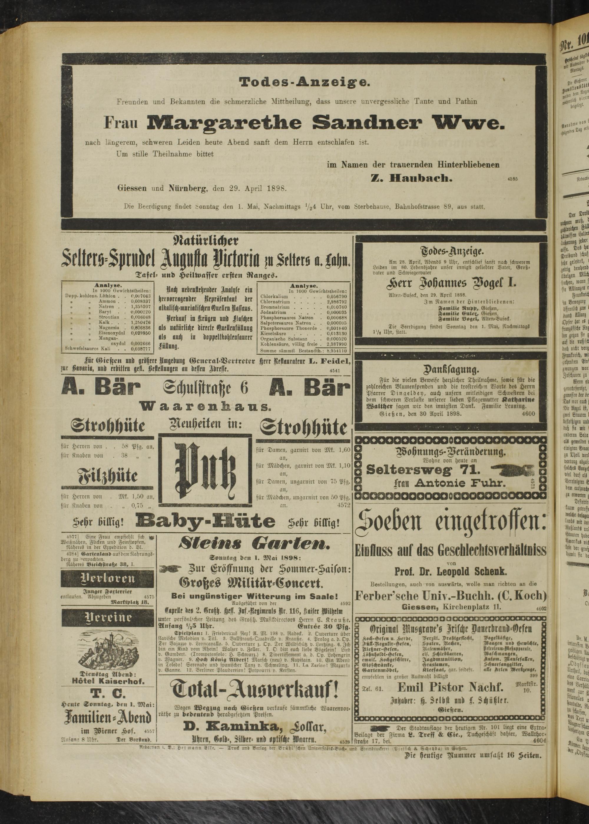 nMF* Der Stadtauflage der heutigen Nr. 101 liegt eine Extra- Beilage der Firma L. Treff & Cie., Tuchgeschäft dahier, Wallthor« straße 17, bei. 4604