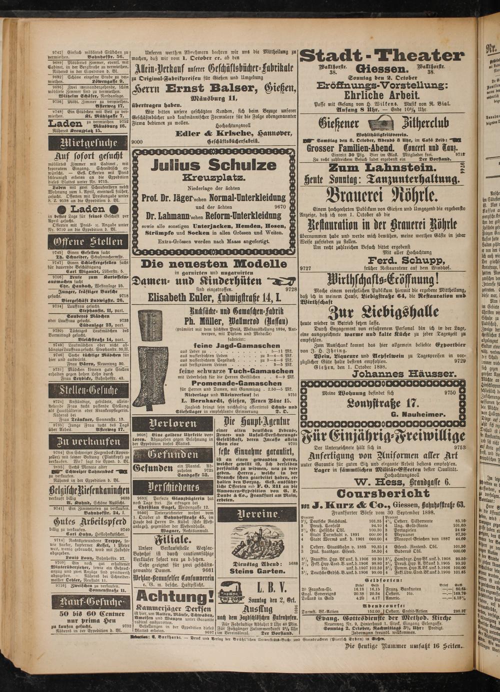 Frankfurter Börse vom 30 September 1898.