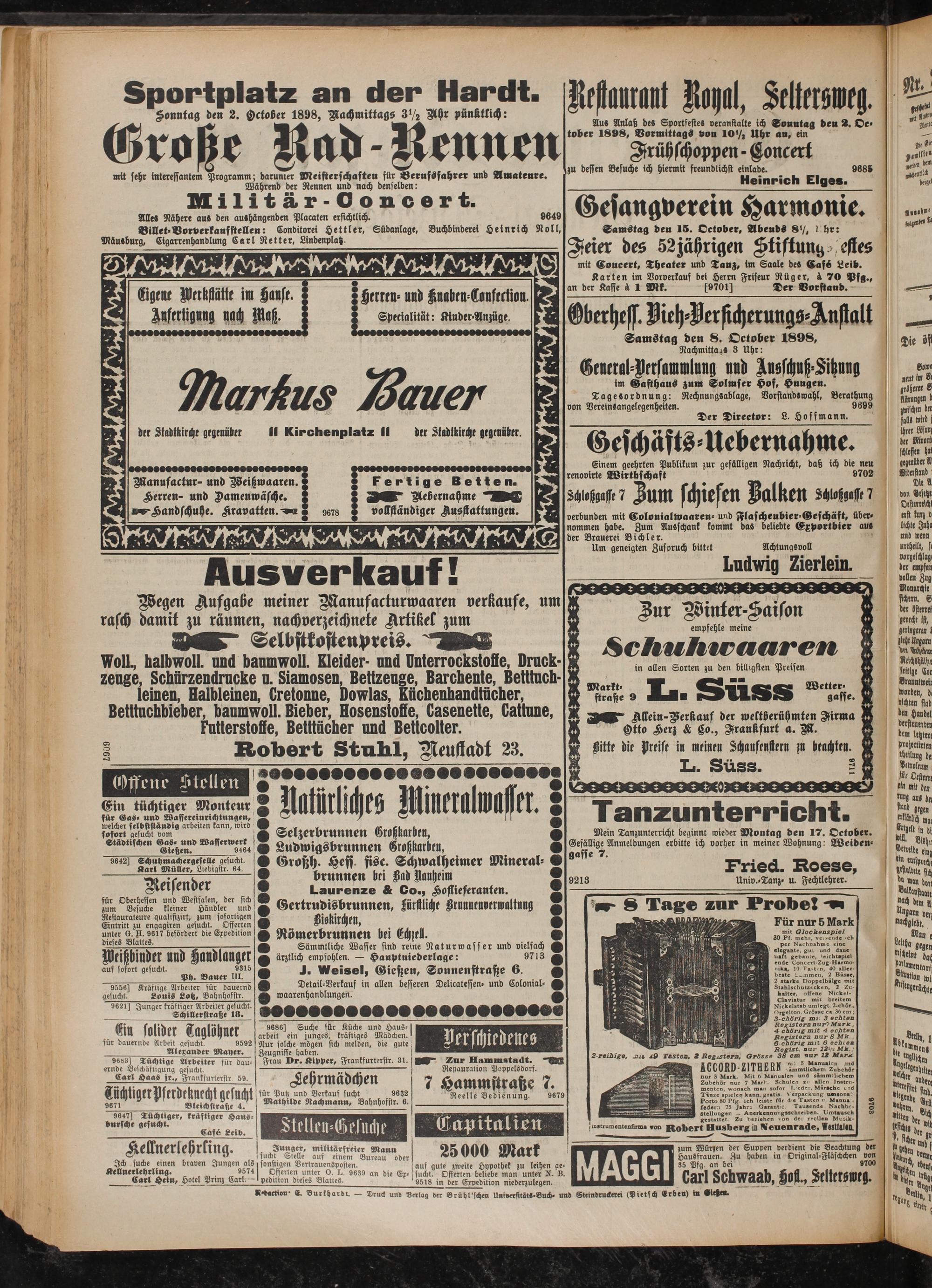 Oberheff. Bieh-Verficherungg-Anstalt Samstag den 8. October 1898, Nachmittags 3 Uhr: