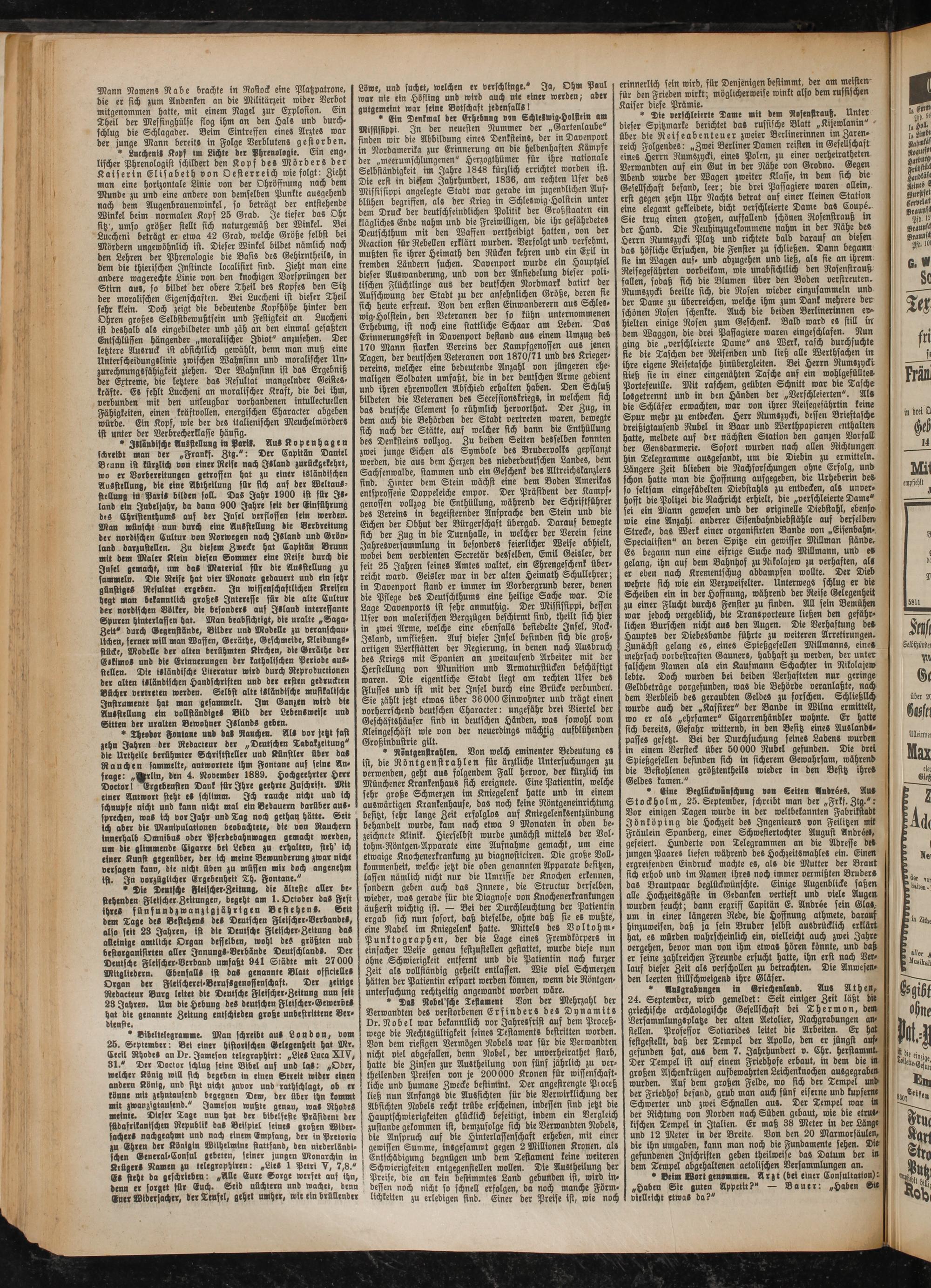 * Das Robel'sche Testament Von der Mehrzahl der Verwandten des verstorbenen Erfinders des Dynamits vr. Nobel war bekanntlich vor Jahresfrist auf dem Proceß- wege die Rechtsgültigkeit seines Testaments bestritten worden. Von dem riesigen Vermögen Nobels war für die Verwandten nicht viel abgefallen, denn Nobel, der unverheirathet starb, hatte die Zinsen zur Austheilung von fünf jährlich zu vertheilenden Preisen von je 200000 Kronen für wissenschaftliche und humane Zwecke bestimmt. Der angestrengte Pioceß ließ nun Anfangs die Aussichten für die Verwirklichung der Absichten Nobels recht trübe erscheinen, indessen sind jetzt die Hauptschwierigkeiten glücklich beseitigt, indem ein Vergleich zustande gekommen ist, demzufolge sich die Verwandten Nobels, die Anspruch auf die Hinterlassenschaft erheben, mit einer gewissen Summe, insgesamwt gegen 2 Millionen Kronen, als Entschädigung begnügen und dem Testament keine wetteren Schwierigkeiten entgegenstellen wollen. Die Austheilung der Preise, die an kein bestimmtes Land gebunden ist, wird indessen noch nicht so schnell erfolgen, da noch manche Förmlichkeiten zu erledigen find. Einer der Preise ist, wie noch