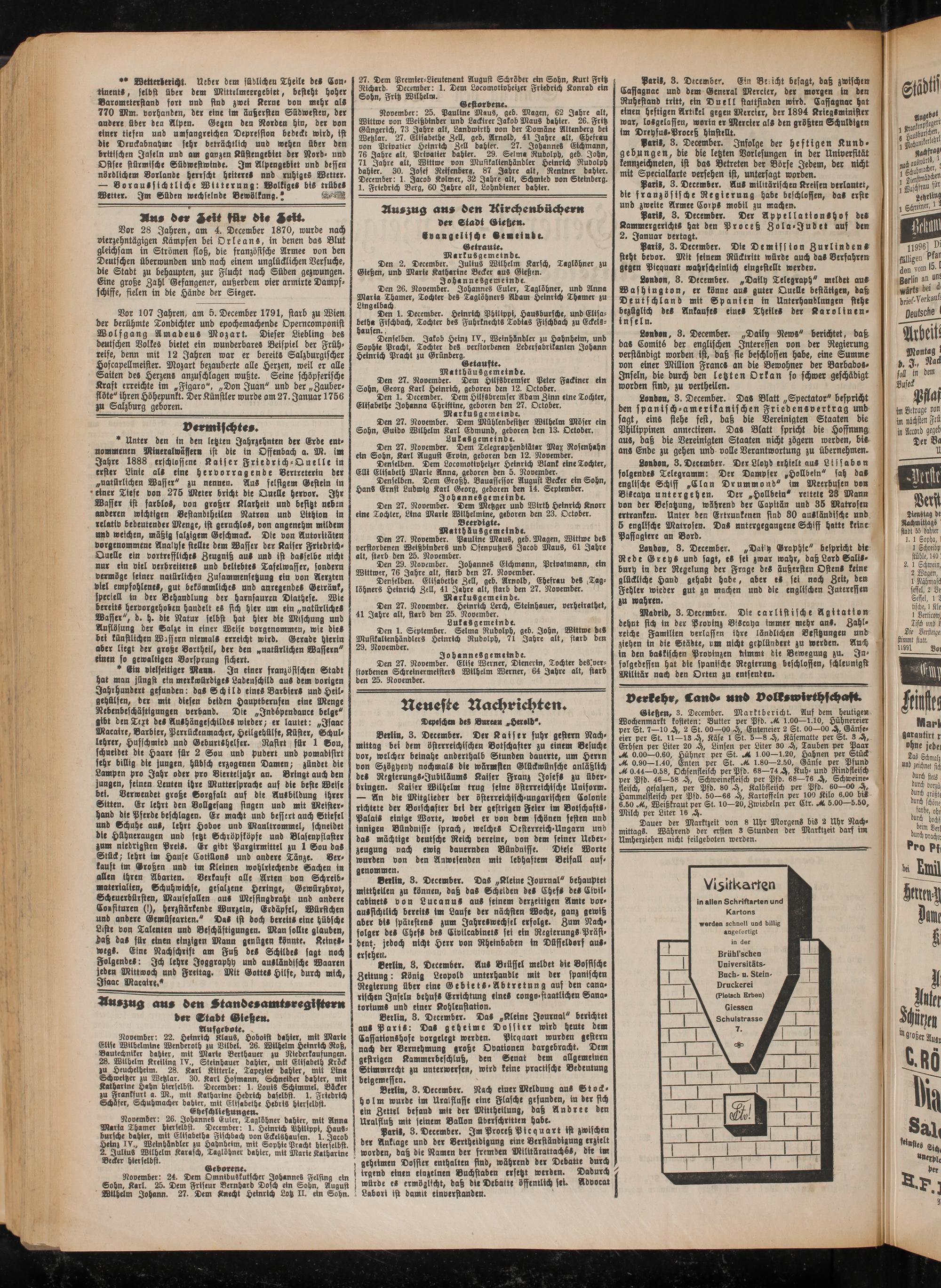 November: 22. Heinrich Klaus, Hoboist dichter, mit Marie Elise Wilhelmine Wenderoth zu Vilbel. 26. Wilhelm Heinrich Roß, Bautechniker dahier, mit Marie Berthauer zu Niederkaufungen. 28. Wilhelm Kreiling IV., Steinhauer dahier, mit Elisabeth Kröck zu Heuchelheim. 28. Karl Kttterle, Tapezier dahier, mit Lina Schweitzer zu Wetzlar. 30. Karl Hofmann, Schneider dahier, mit Katharine Hahn hterselbst. December: 1. Louis Schimmel, Bäcker zu Frankfurt a. M., mit Katharine Hedrtch daselbst. 1. Friedrich Schäfer, Schuhmacher dahier, mit Elisabethe HebrtS hterselbst.