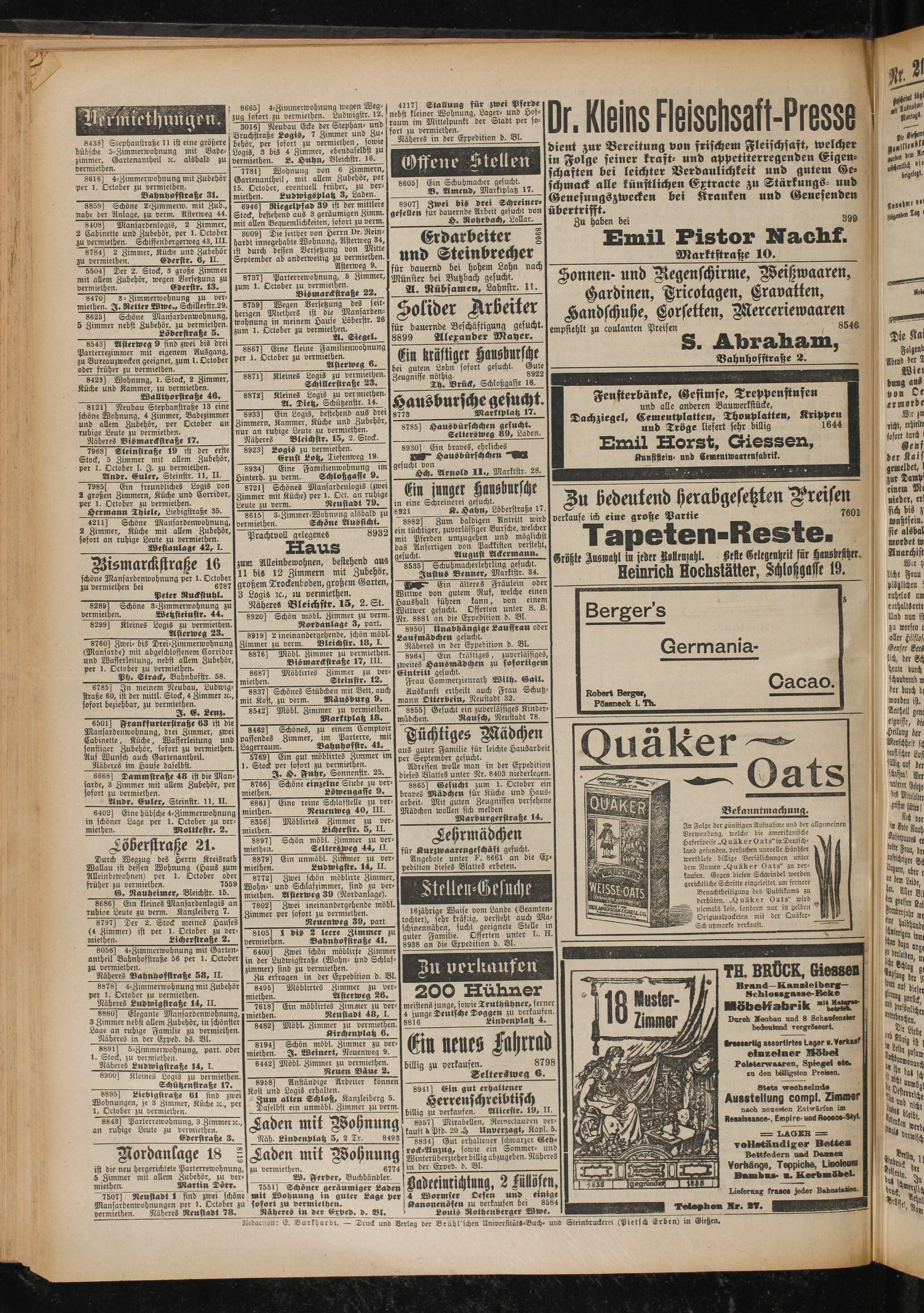 Adressen wolle man in der Expedition dieses Blattes unter Nr. 8403 niederlegen. I 8865] Gesucht zum 1. October ein braves Mädchen für Kücke und Hausarbeit. Mit guten Zeugniffen versehene Mädchen wollen fick melden Marburgerstratze 14.