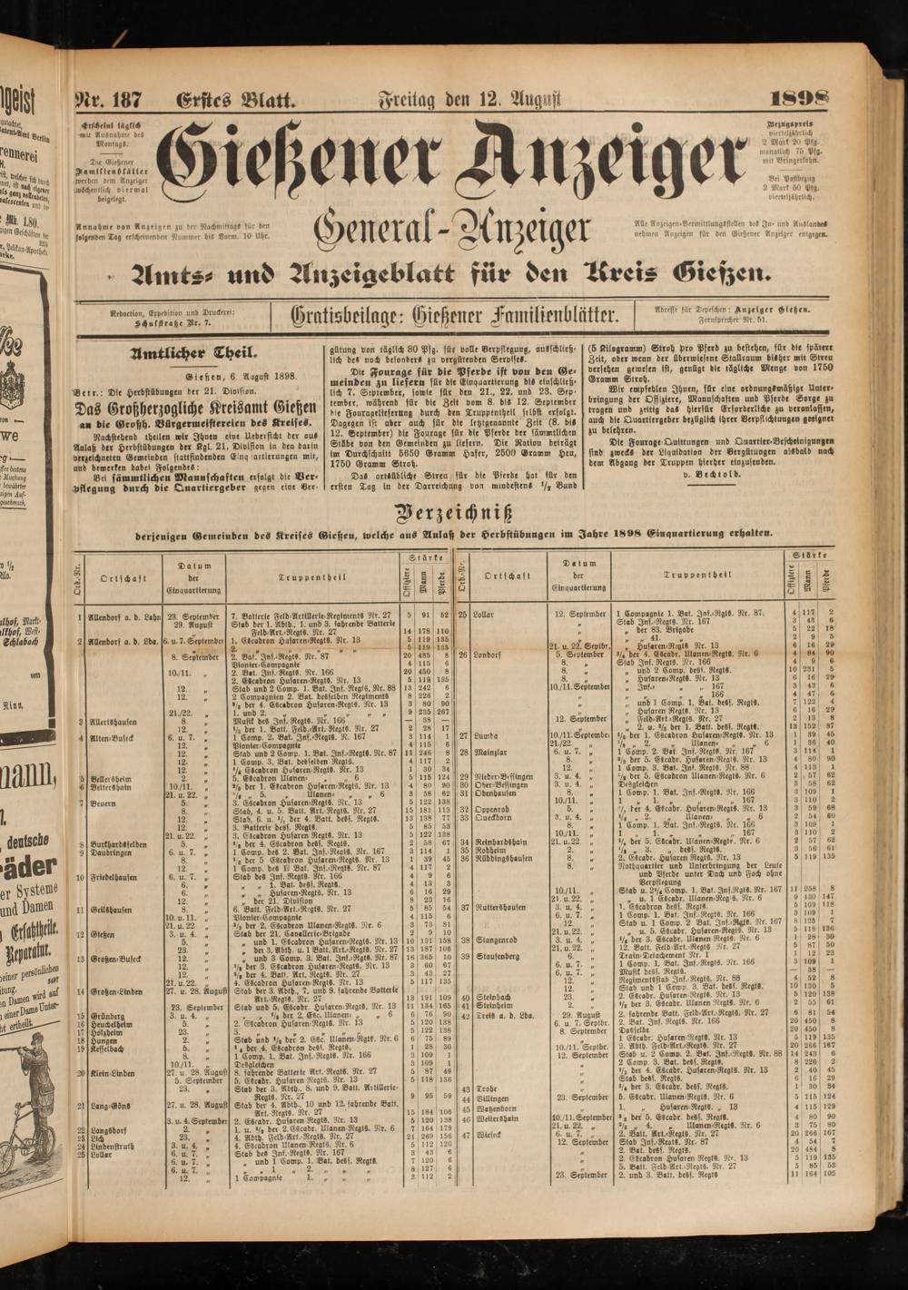 derjenigen Gemeinden des Kreifes Gießen, welche aus Anlaß der Herbftübuugen im Jahre 1898 Einquartierung erhalten.