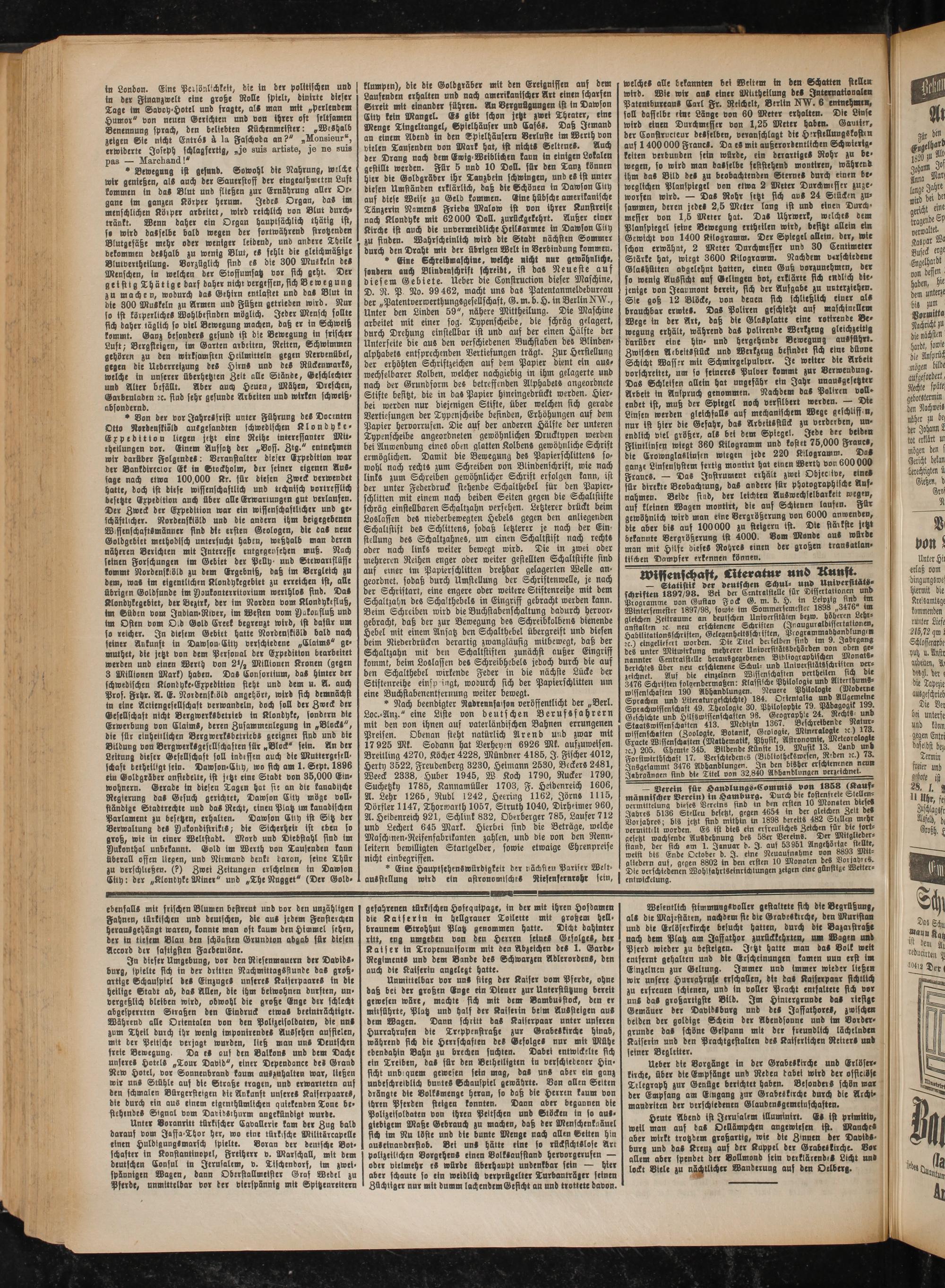 ♦ Bon der vor Jahre»srist unter Führung de» Docrnten Otto Nordenfkiöld aurgesandten schwedischen Klondyke- Expedition liegen jetzt eine Reihe intereflanter Mit- rheilungen vor. Einem Aufsatz der „Boff. Ztg." entnehmen wir darüber Folgende»: Veranstalter dieser Expedition war der Bankdirector Ek in Stockholm, der seiner eigenen Aussage nach etwa 100,000 Kr. für diesen Zweck verwendet hatte, doch ist diese wtffrnschaftlich und technisch vortrefflich besetzte Expedition auch über alle Erwartungen gut verlaufen. Der Zweck der Expedition war ein wiffenschaftlicher und geschäftlicher. Nordenfkiöld und die andern ihm beigegebenen W ffenschaftSwänner find die ersten Geologen, die da» nene Goldgebiet methodisch untersucht haben, weßhalb mau deren näheren Berichten mit Interesse entgegensehen muß. Nach seinen Forschungen im Gebiet der Pellh- und Stewartflüsie kommt Nordenfkiöld zu dem Ergebuiß, daß im Vergleich zu dem, wa» im eigentlichen Klondhkegebiet zu erreichen ist, alle übrigen Goldfunde im Noukonterritoriurn werthlo» find. Da» Slondykegebiet, der Bezirk, der im Norden vom Kloudykrfluß, im Süden vorn JndiawRiver, im Westen vorn Uakor-fluß und im Osten vorn O.d Gold Creek begrenzt wird, ist dafür um so reicher. In diesem Gebiet hatte Nordenskiöld bald nach seiner Ankunst in Dawsou City verschiedene „Claims" ge- muthet, die jetzt von dem Personal der Expedition bearbeitet werden und einen Werth von 2*/s Millionen Kronen (gegen 3 Millionen Mark) haben. Da» Consortium, da» hinter der schwedischen Klondyke-Expeditiou steht und dem u. A. auch Prof. Frhr. A. E. Nordenskiöld angehört, wird fich demnächst tu eine Acttengesellschast verwandeln, doch soll der Zweck der Gesellschaft nicht BrrgwerkSbetrieb in Kloudyke, sondern die Erwerbung von Claims, deren Zusammenlegung in „Blockt", die sür einheitlichen Bergwerksbetrieb» geeignet find und die Bildung von BergwerkSgesrllschaften sür „Block" sein. An der Leitung dieser Gesellschaft soll iudeffen auch die Muttergesell' schäft betheiligt sein. Dawfon-Cith, wo fich am 1. Sept. 1896 ein Goldgräber anfiedelte, ist jetzt eine Stadt von 35,000 Einwohnern. Gerade in diesen Tagen hat sie an die kanadische Regierung da» Gesuch gerichtet, Dawson City wöge vollständige Stadtrechte und da» Recht, einen Platz tm kanadischen Parlament zu besetzen, erhalten. Dawson City ist Sitz der Verwaltung de» VukondistriklS- die Sicherheit ist eben so groß, wie in einer Weltstadt. Mord und Diebstahl sind im Nukonthal unbekannt. Gold im Werth von Tausenden kann Überall offen liegen, und Niemand denkt fcaion, seine Thür zu verschlteßen. (?) Zwei Zeitungen erscheinen in Dawson City: der „Kloudyke Miner" und „The Nugget" (Der Gold