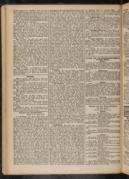 Den 8. Januar. Emil Friedrich Richard Schudt, Amtsrichter zu Homberg a. O., und Wilhelmine Lina Natalie Emma Weiffenbach, Tochter des verstorbenen Gymnasial-ProfessorS Ferdinand Weiffmbach zu Gießen.