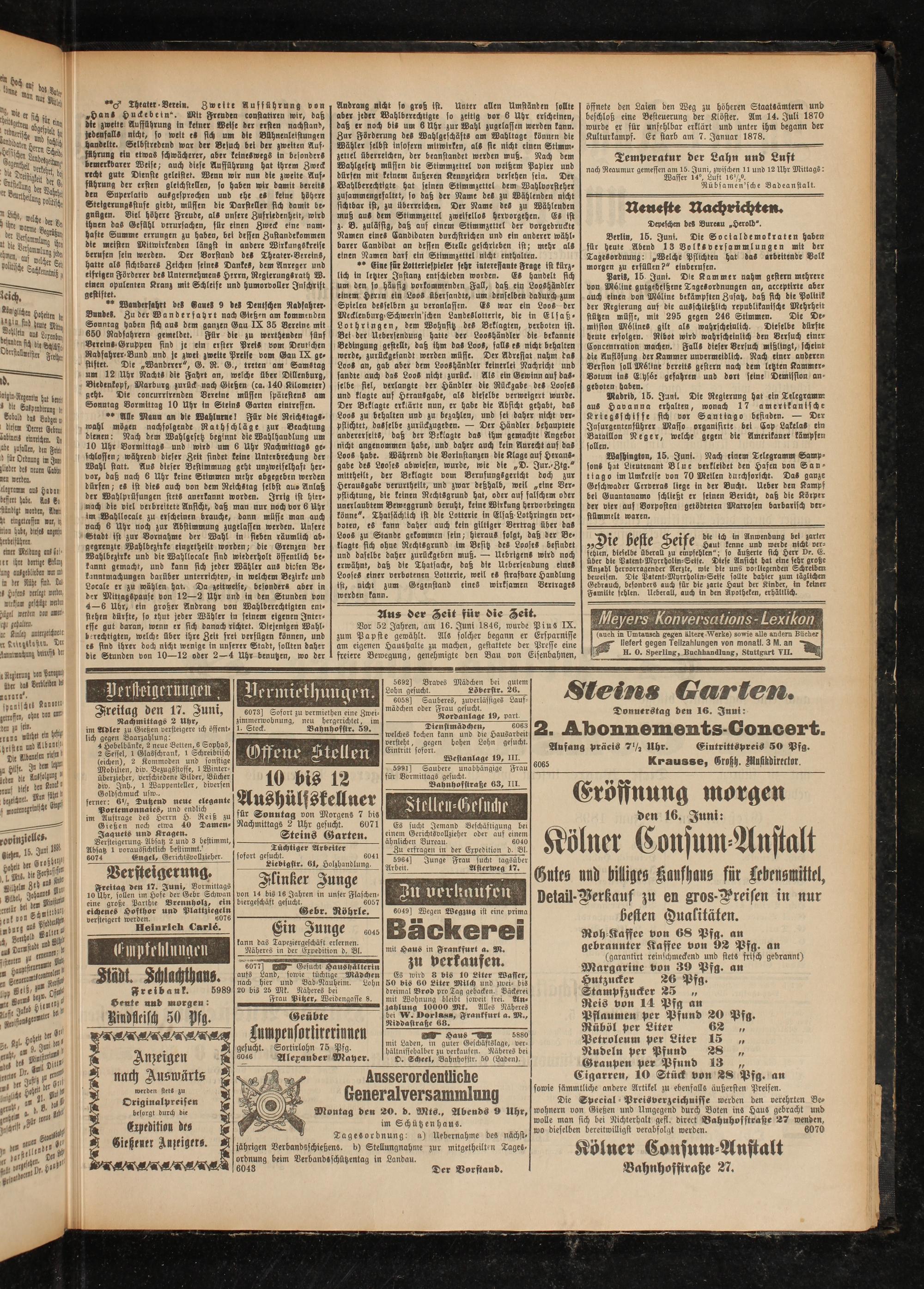 Cigarren, 10 Stück von 28 Pfg. an sowie sämmtliche andere Artikel zu ebenfalls äußersten Preisen. Die Special - Preisverzeichnisse werden den verehrten Bewohnern von Gießen und Umgegend durch Boten ins Haus gebracht und wolle man fich bei Nichterhalt gefl. direct Bahnhofstraße Ä7 wenden, wo dieselben bereitwilligst verabfolgt werden. 6070