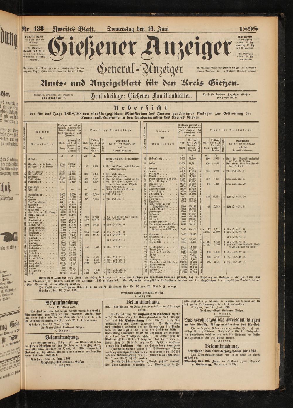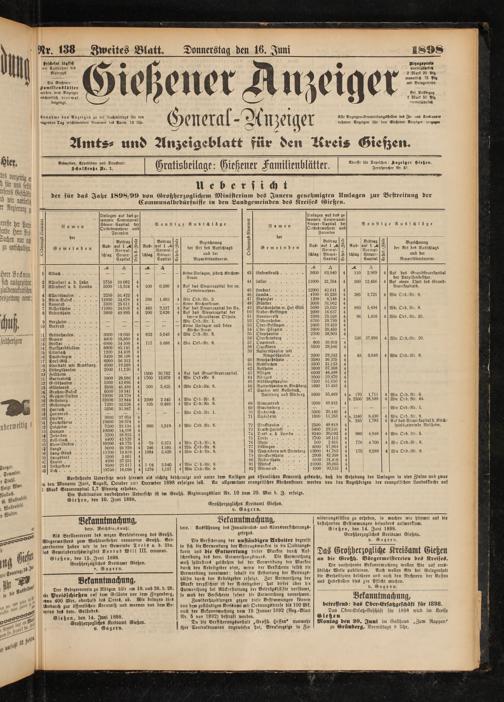 der für das Jahr 1898/99 von Grotzherzoglichem Ministerium des Innern genehmigten Umlagen zur Bestreitung der Communalbedürfnisse in den Landgemeinden des Kreises Gießen.