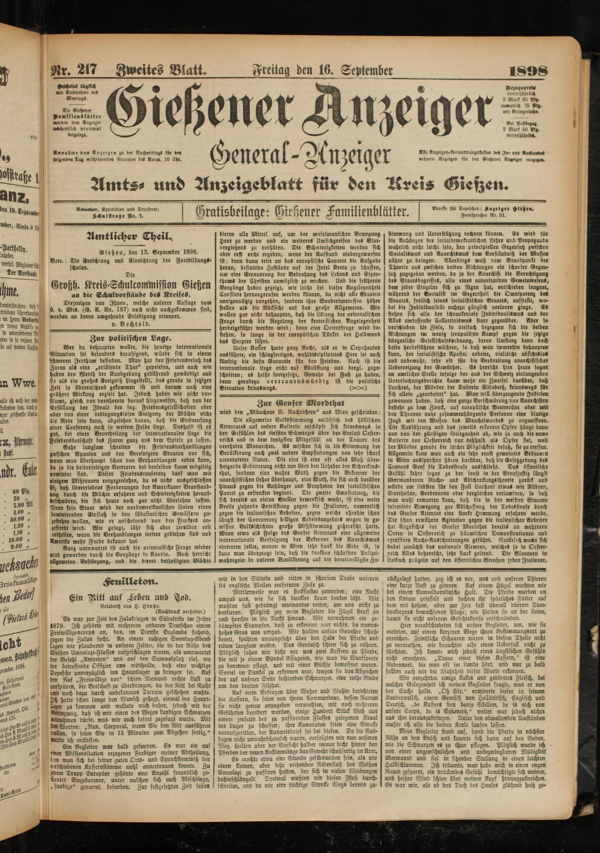 Dte allgemeine VolkSstiwmung anläßlich des höllischen Attentates auf unsere Kaiserin erschöpft fich keineswegs in den Gefühlen des tiefsten Schmerzes über deu Verlust Oesterreichs und in dem innigsten Mitgefühl au der Trauer des verehrten Monarchen. Es mischen fich In die Stimmung der Bevölkerung noch zwei andere Empfindungen von sehr scharf aceentuirter Natur. Die eine ist eine oft alles Maß übersteigende Erbitterung nicht nur über den Urheber der Schreckens- that, sondern eine wahre Wuth gegen dte Bekenner der auarchitstscheu Lehre überhaupt, eine Wuth, dte fich auch darüber hinaus gegen die Anhänger und Propheten der socialisttscheu Partei za erstrecken beginnt. Dte zwette Empfindung, die fich bereits an vielen Stellen bemerklich macht, ist eine wette Kreise ziehende Entrüstung gegen dte Italiener, namentlich gegen dte italienischen Arbeiter, gegen welche ohnehin schon längst der Concurrenz billigen Arbeitsangebots wegen in ge- wiffen Volksschichten große Mißstimmung geherrscht hatte. Wenn etwa als Folge de» Senser Attentat» eine allgemeine internationale Verfolgung der Bekenner de» Anarchismus eintreten sollte, wovon tu Wien sehr stark die Rede ist, so kann man überzeugt sein, daß dir denkbar schärfsten Polizei- maßregeln in unserer Bevölkerung auf dte bereitwilligste Zu-
