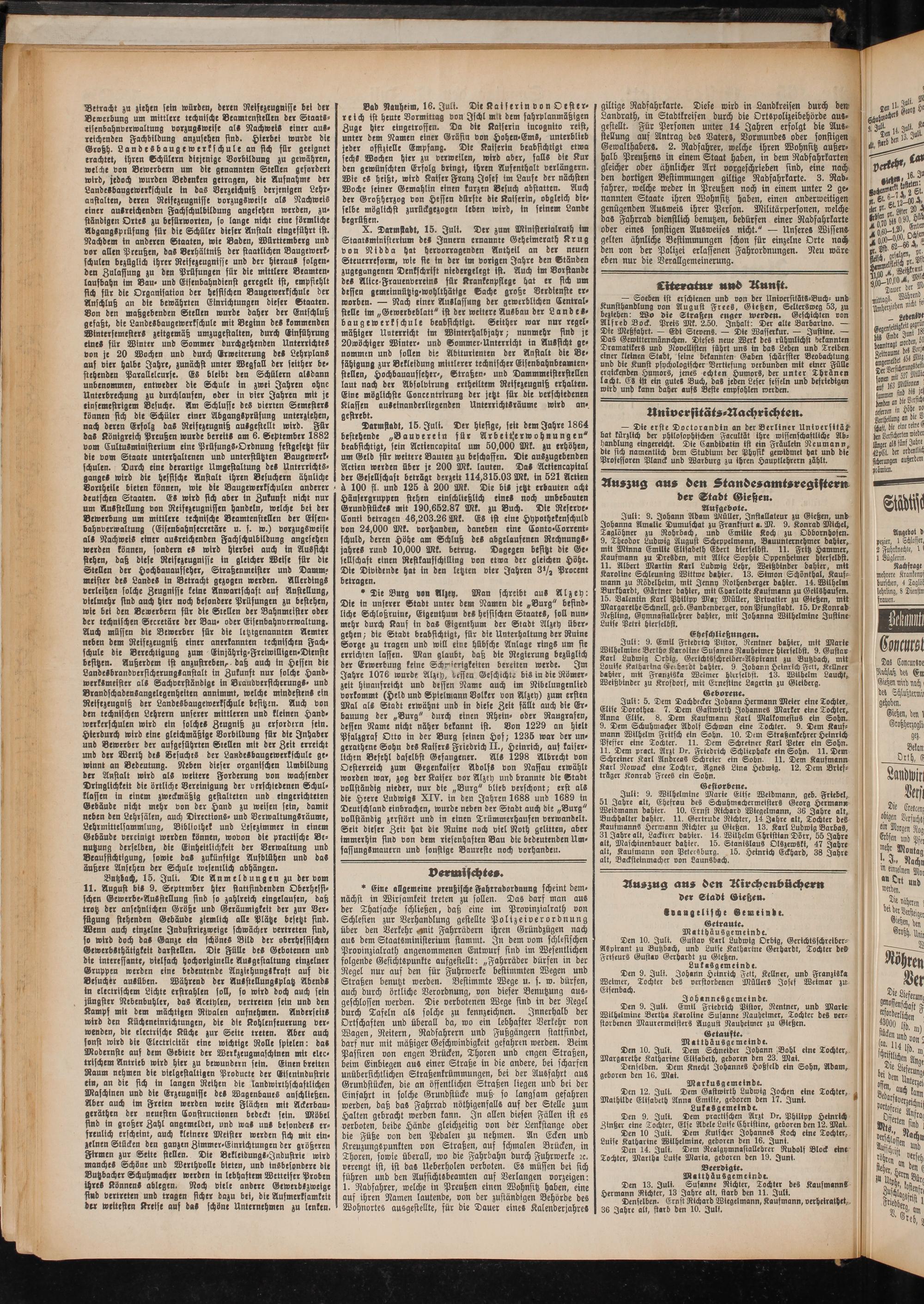 Juli: 9. Johann Adam Müller, Installateur zu Gießen, und Johanna Amalie Dumuschat zu Frankfurt a. M. 9. Konrad Michel, Taglöhner zu Rohrbach, und Emilie Koch zu Obbornhofen. 9. Theodor Ludwig August Scheppelmann, Bauunternehmer dahier, mit Minna Emilie Elisabeth Ebert bierselbst. 11. Fritz Hammer, Kaufmann zu Dresden, mit Alice Sophie Oppenheimer Hierselbst. 11. Albert Martin Karl Ludwig Lehr, Weißbinder dahier, mit Karoline Schleuning Wittwe dahier. 13. Simon Schönthal, Kaufmann zu Rödelheim, mit Jenny Rothenberger dahier. 14. Wilhelm Burkhardt, Gärtner dahier, mit Coarlotte Kaufmann zu Geilshausen. 15. Valentin Karl Philipp Max Müller, Privatier zu Gießen, mit Margarethe Schnell, geb.Gandenberger, von Pfungstadt. 15. vr Konrad Rehling, Gymnasiallehrer dahier, mit Johanna Wilhelmine Justine Luise Petri Hierselbst.