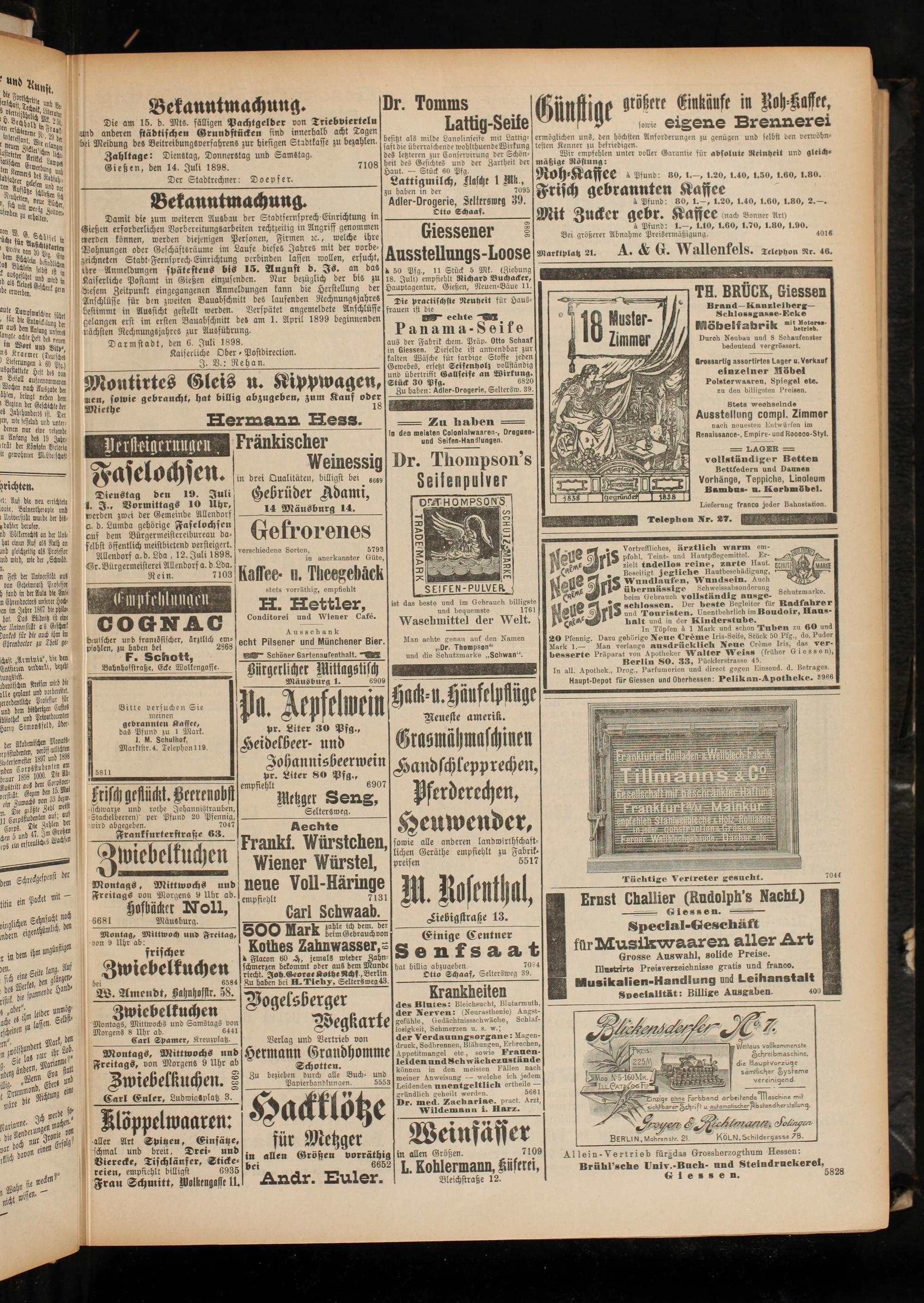 Zahltage: Dienstag, Donnerstag und Samstag. Gießen, den 14. Juli 1898.