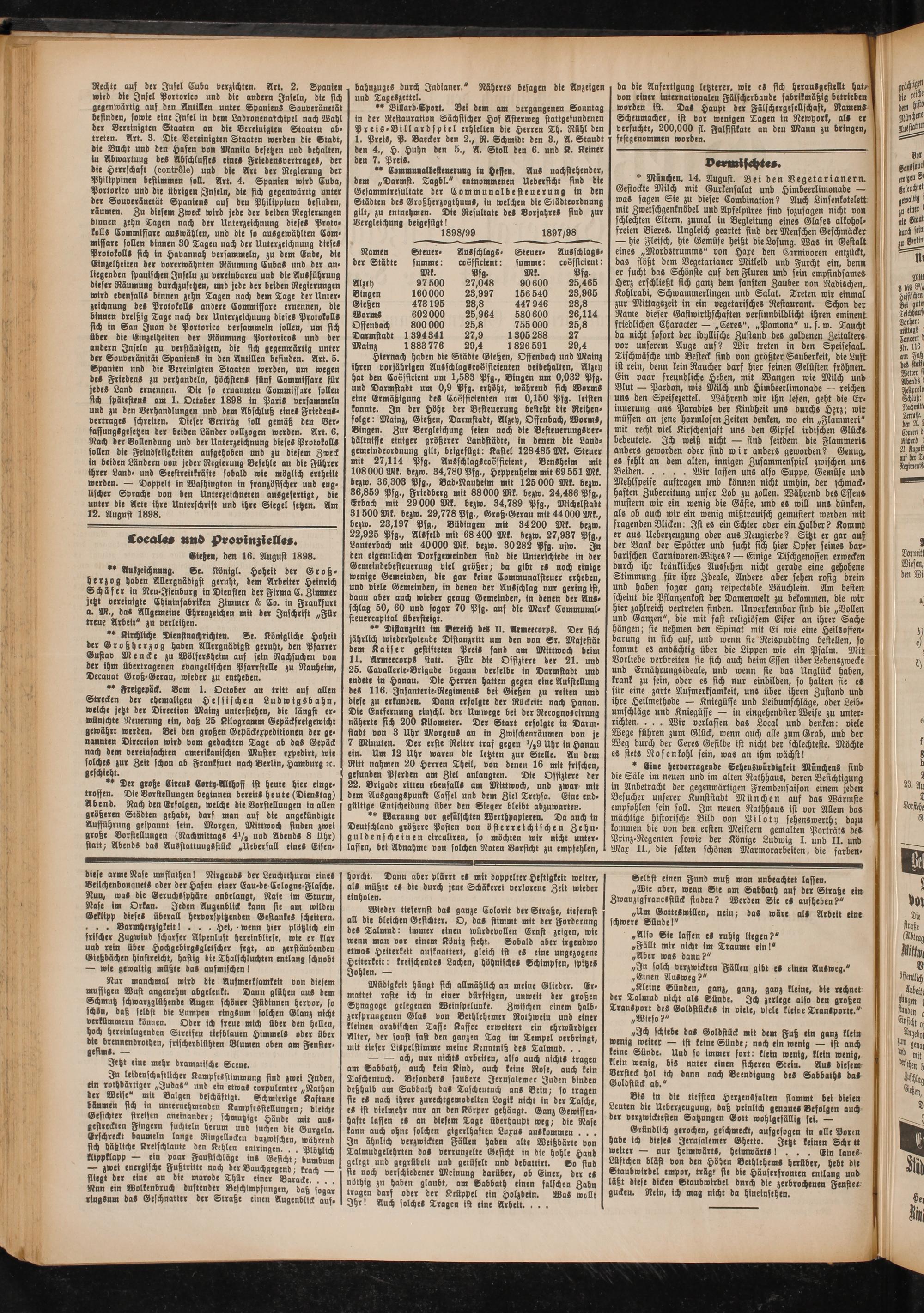 • • Commuoalbesteuttuug in Hessen, Aus nachstehender, dem „Darmst. Tagbl." eotnommeoen Ueberficht find die Gesammtresultate der Commuualbesteueruog in den Städten de- Großherzogthums, in welchen die Städteorduung gilt, zu entnehmen. Die Resultate des Vorjahres find zur Vergleichung beigefügt!