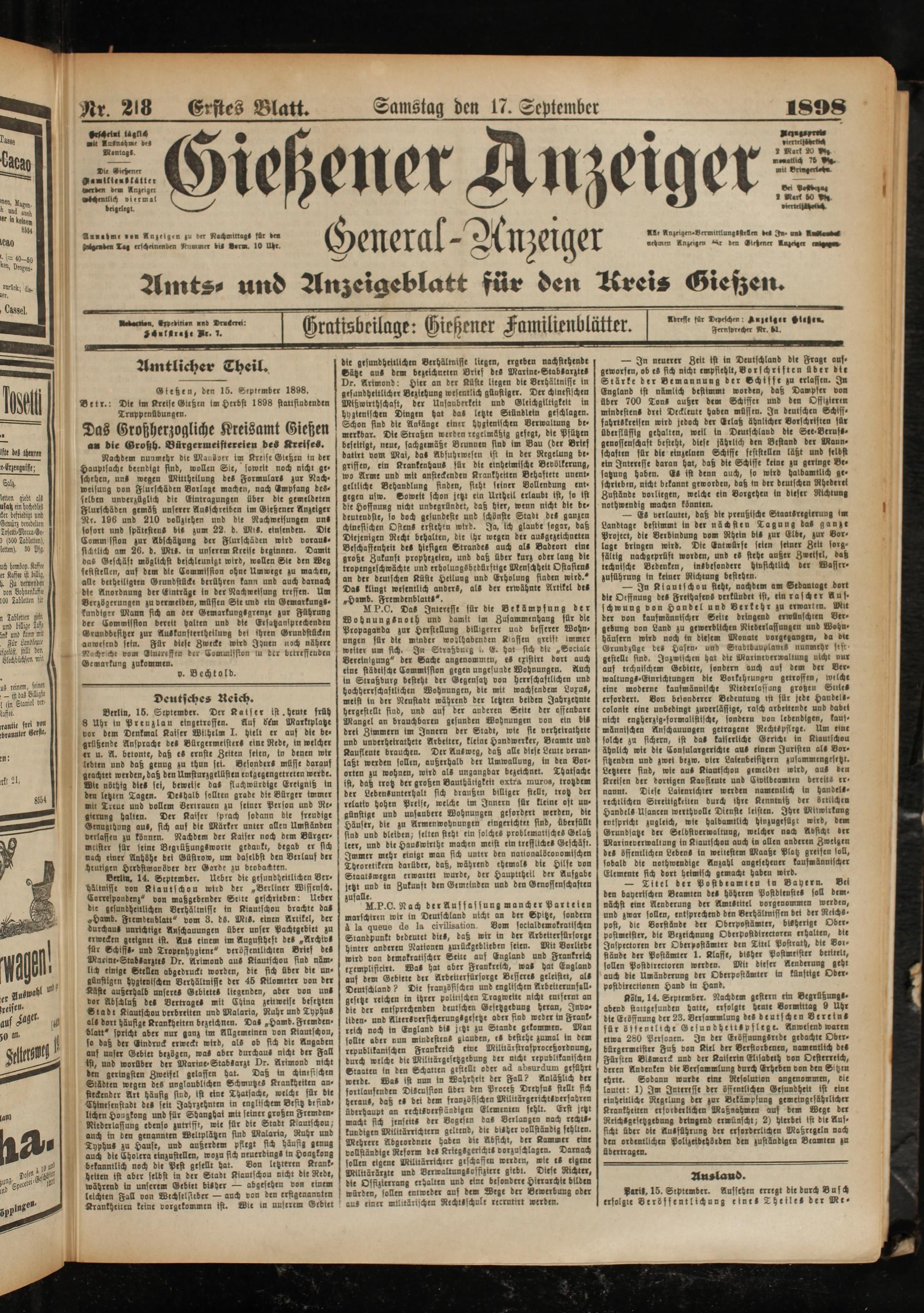 Nr 218 Erstes Blatt.Samstag den 17. September