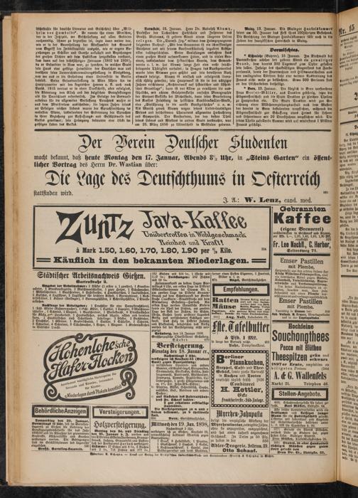 macht bekannt, daß heute Montag den 17. Januar, Abends 8‘k Uhr, in „Steins Garten" ein öffent licher Vortrag des Herrn Dr. Wastian über:
