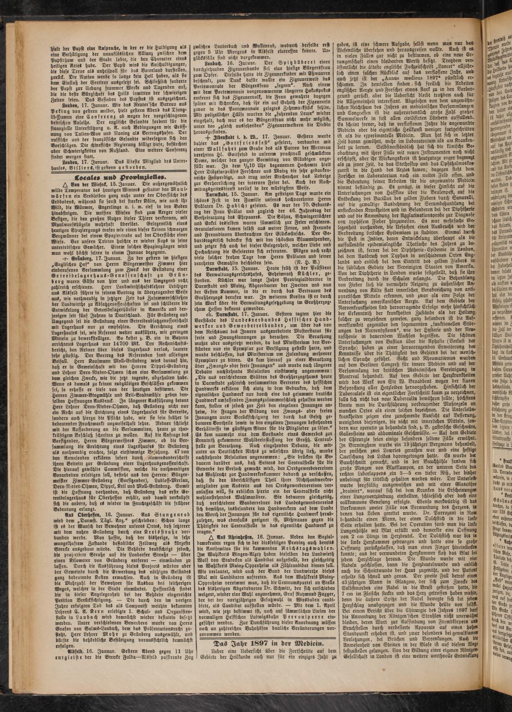 geben, ist eine schwere Ausgabe, selbst wenn man nur bat Wesentliche übersehen und herausgreifen wollte. Auch ist e» in vielen Fällen gar nicht zu bestimmen, ob eine neue Errungenschaft einen bleibenden Werth besitzt. Trotzdem veröffentlicht die älteste englische Fachzeitschrift„Lancet" alljähr- lich einen solchen Rückblick auf das verflossene Jahr, und auch jetzt ist der „Annus medicus 1897* pünktlich er- L - ^Er