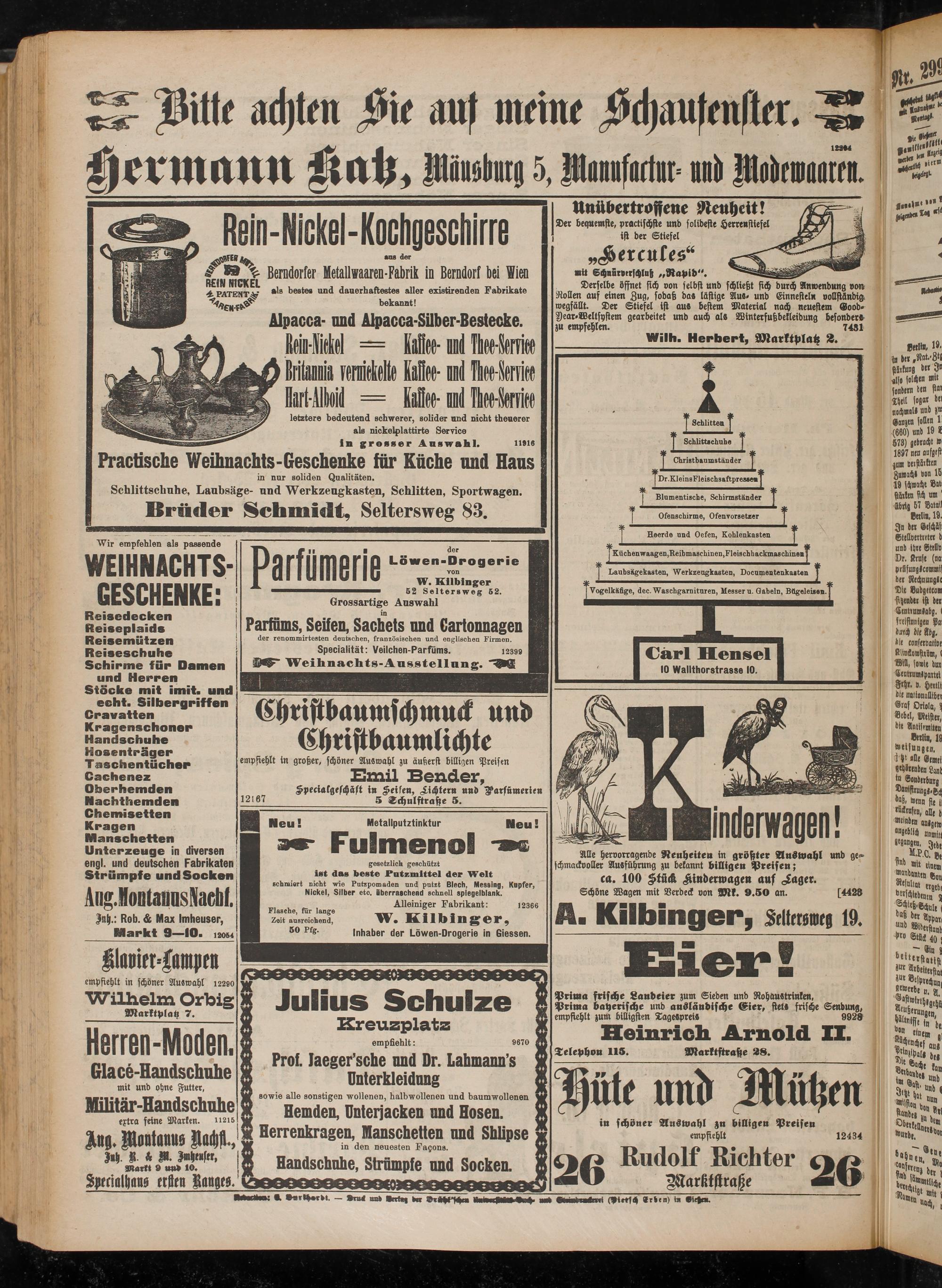 Heerde und Oefen, Kohlenkasten ^Küchenwaagen,Reibmaschinen.Fleischhackmaschinen^ J^>aubsägekasten^Werkze^ka8ten^Documentenkaate^^ Vogelkäfige, dec. Waschgarnituren, Messer u. Gabeln, Bügeleisei